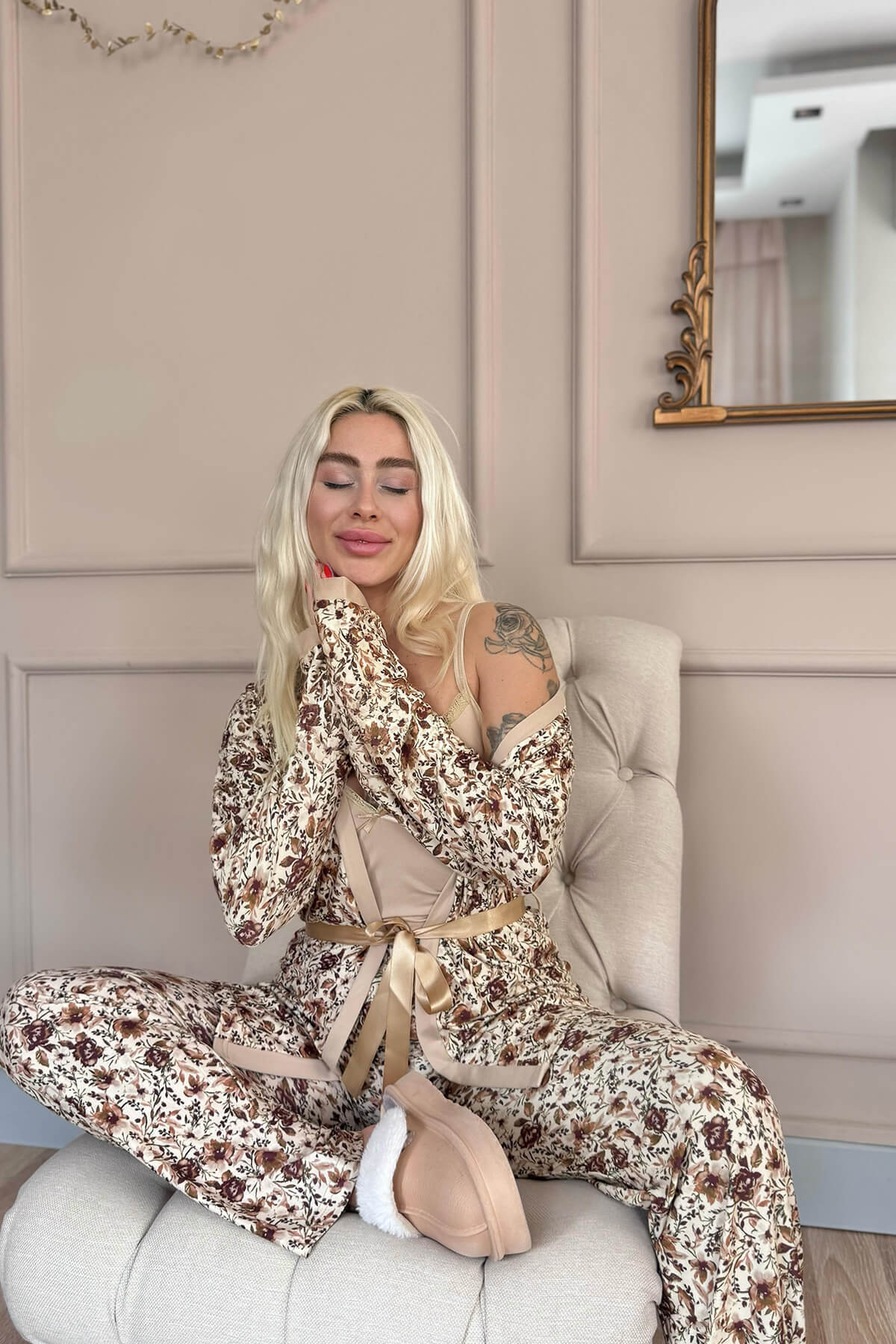 3’lü Set: İp askılı iç pijama, uzun kollu sabahlık ve uzun pijama altı içerir.