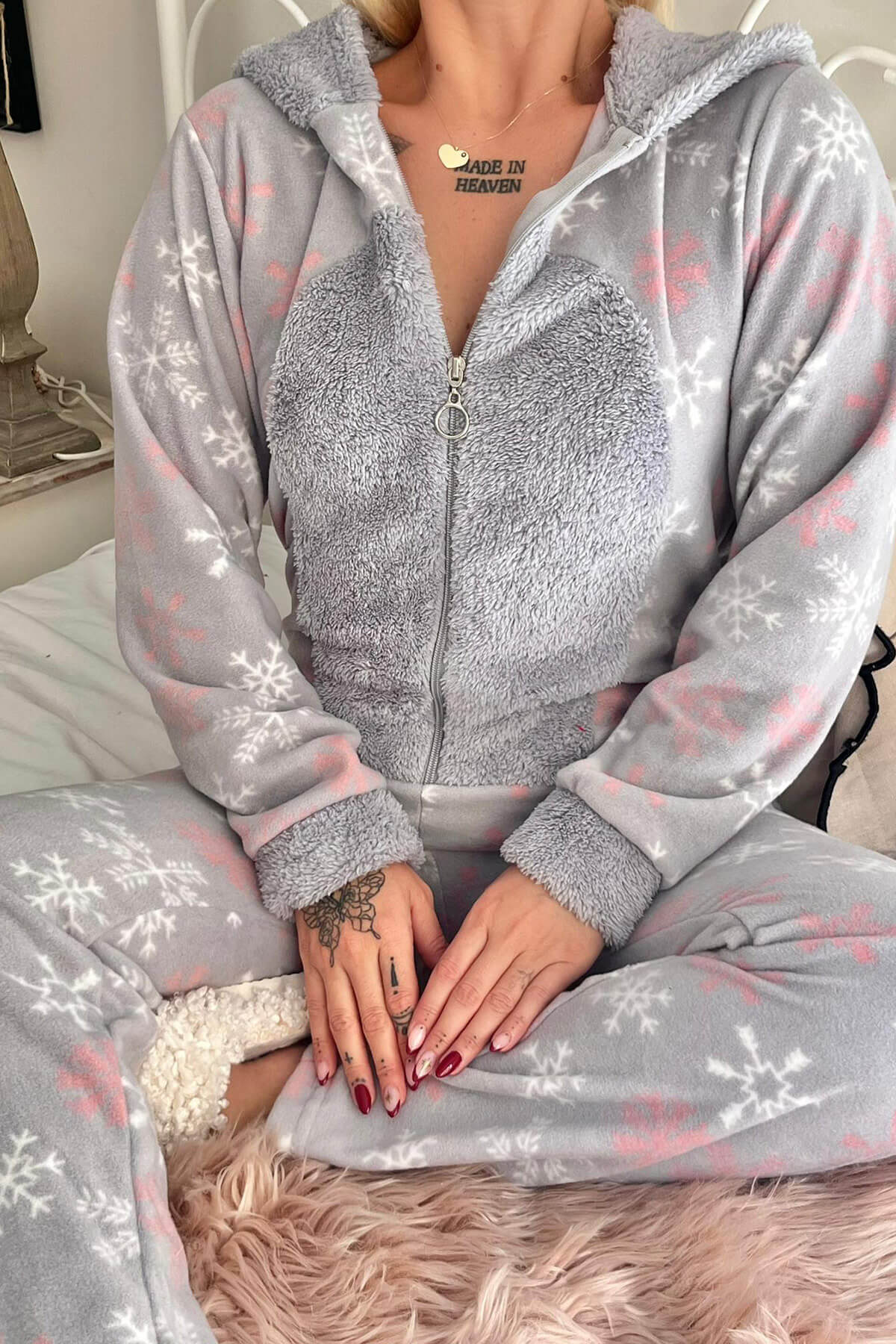 • Gri Kar Tanesi Desenli Kadın Polar Peluş Tulum Pijama, kışın soğuk günlerinde sizi sıcacık tutacak mükemmel bir seçimdir. Bu tulum, yumuşacık polar ve peluş kumaşı sayesinde üstün bir konfor sunar. Nötr gri rengi ve kar tanesi desenleri ile hem şık bir görünüm kazandırır, hem de kışın ruhunu yansıtır. Tek parça tulum tasarımı sayesinde vücudunuzu tamamen sarar ve soğuk havalarda bile sizi sıcak tutar. Kullanıcı yorumlarına göre, bu tulum sıcaklık konusunda beklentileri karşılıyor ve defosuz bir ürün kalitesi sunuyor. Beden seçimi konusunda, eğer dar bir kesim isterseniz kendi bedeninizde tam oturan bir seçim yapabilir, daha bol bir kesim için bir beden büyük tercih edebilirsiniz. Hem evde rahatça kullanabileceğiniz hem de sevdiklerinize hediye edebileceğiniz bu özel tasarım, her yaş grubuna hitap eder.
