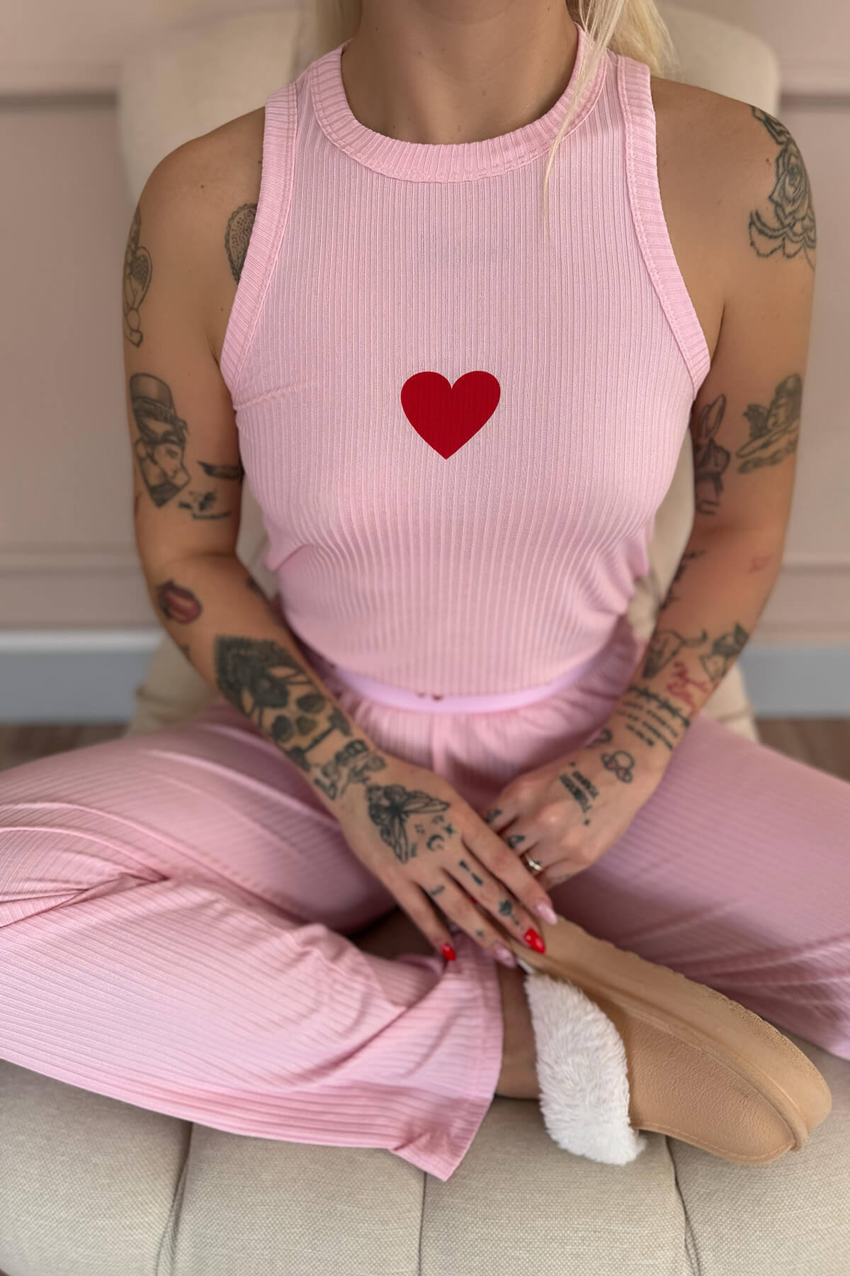 Pembe Amour Coeur Desenli Örme Sıfır Kol Kadın Pijama Takımı