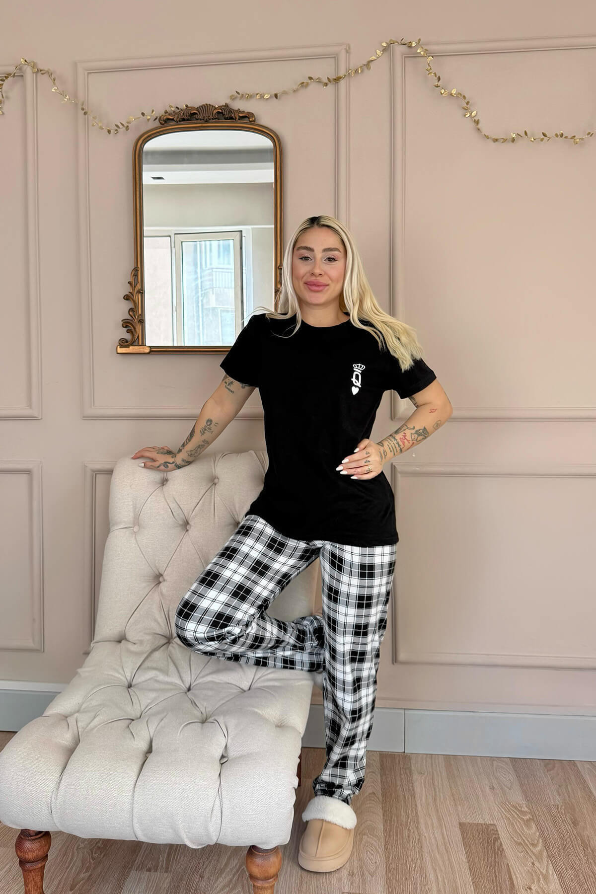 Siyah Queen Kısa Kol Sevgili Aile Pijaması - Kadın Takımı