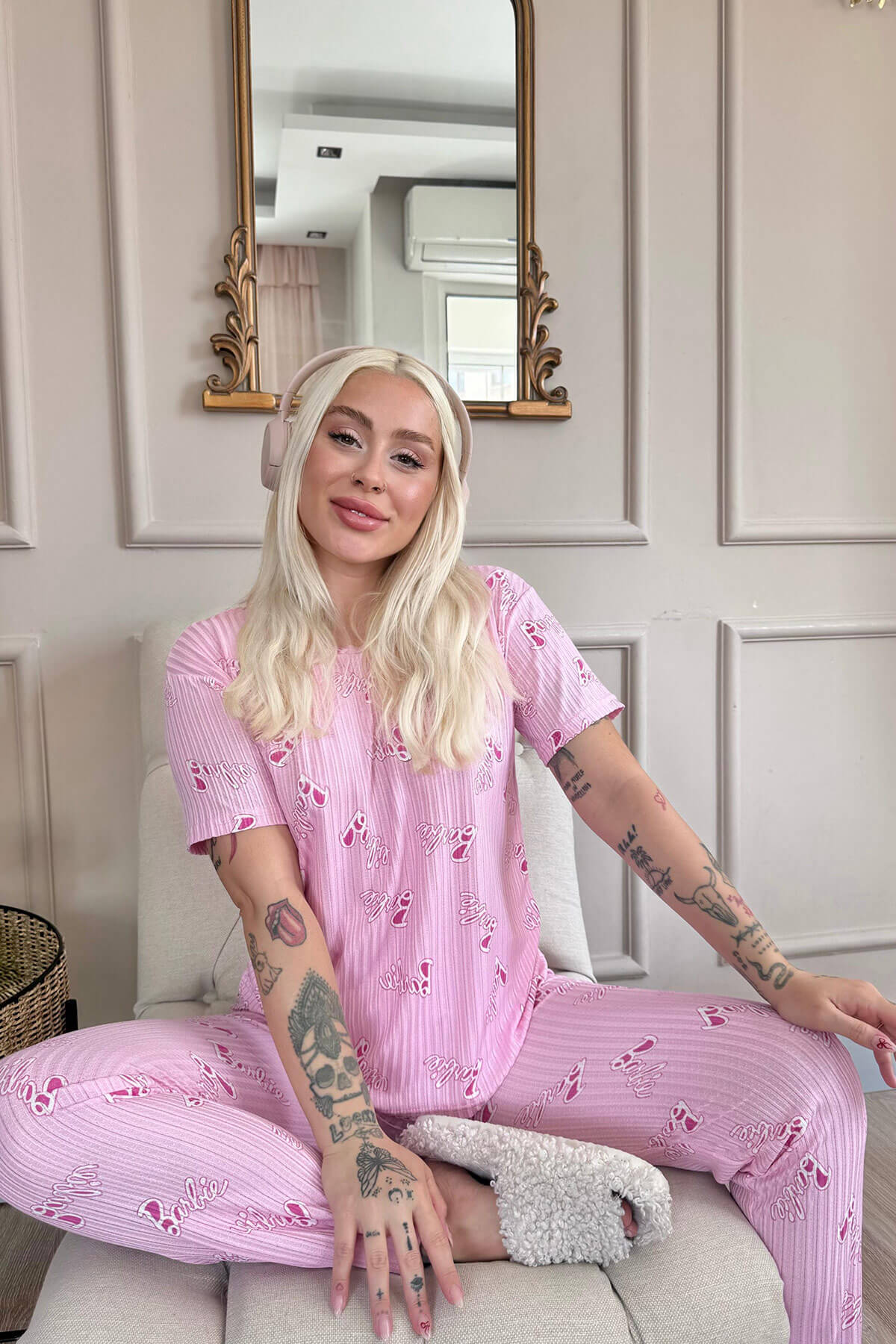 Açık Pembe Desenli Kısa Kol Örme Zincir Kadın Pijama Takımı