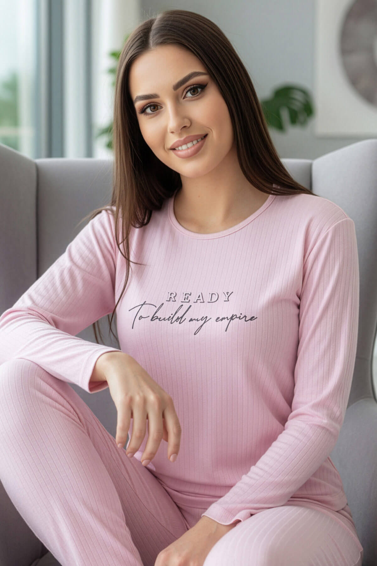 Açık Pembe Ready Desenli Uzun Kollu Dublin Örme Kadın Pijama Takımı