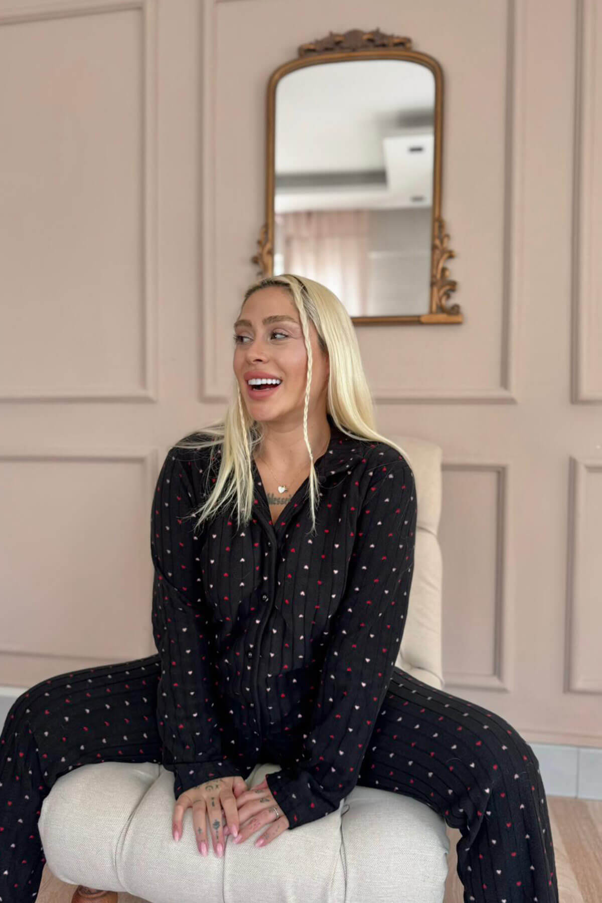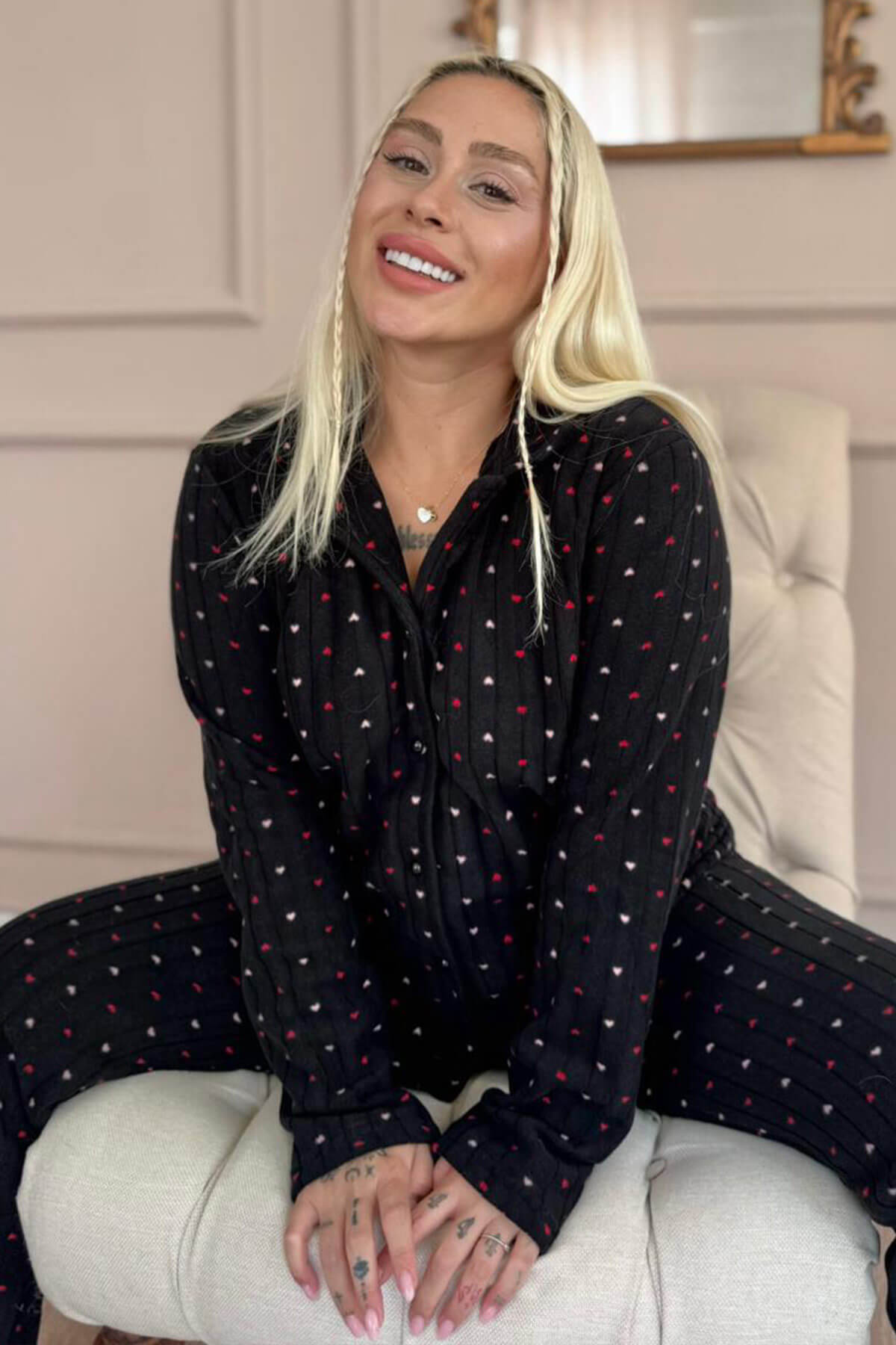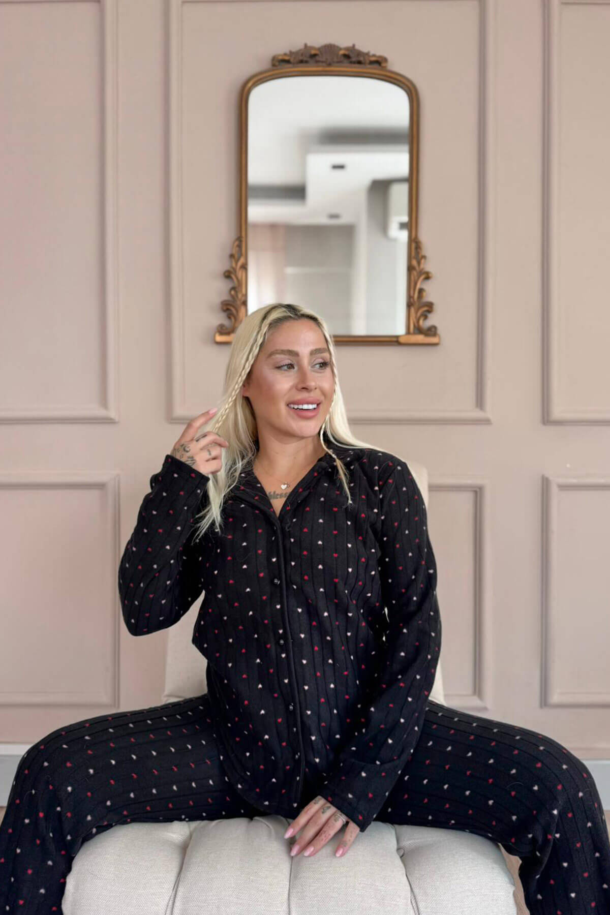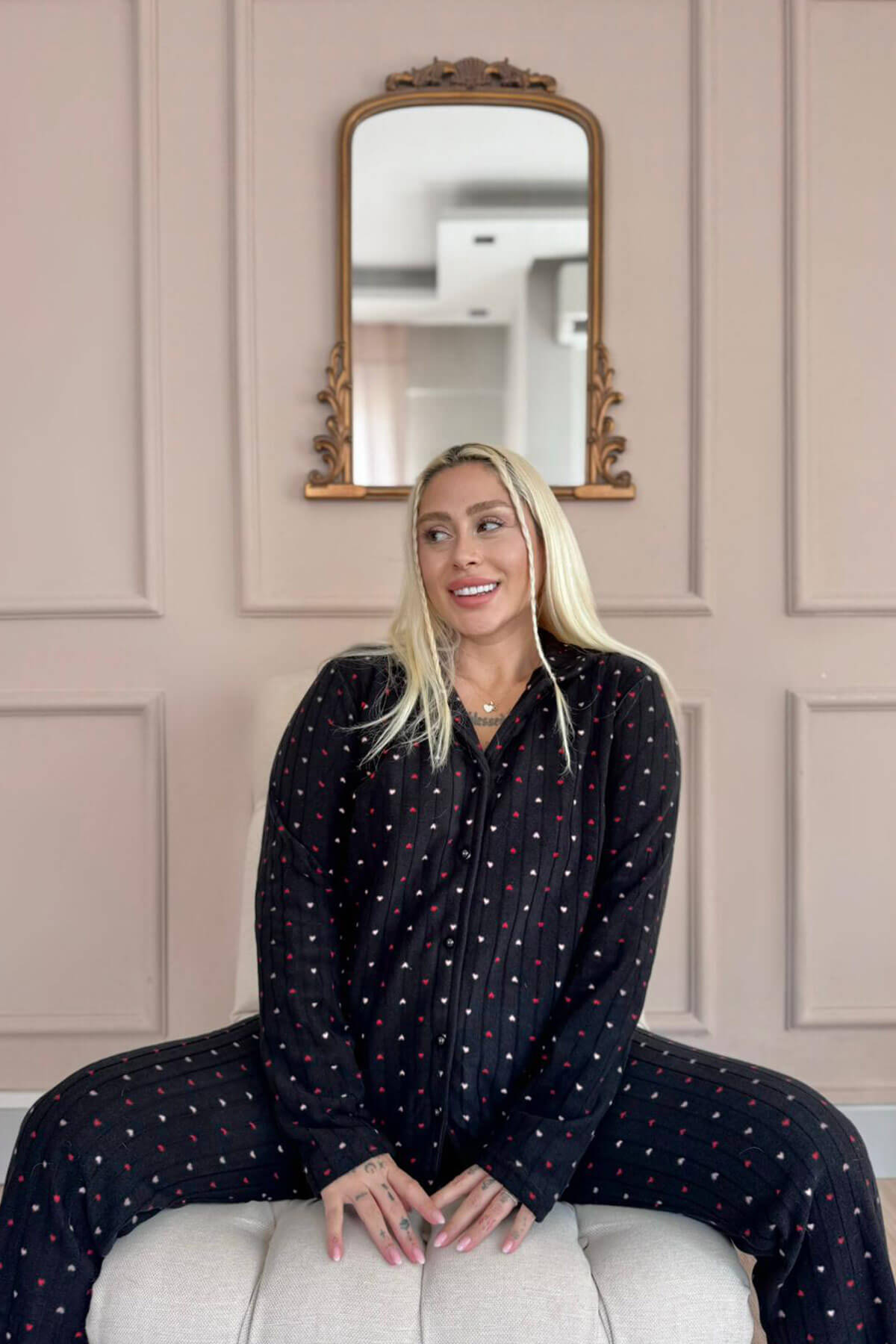 Siyah Puan Desenli Bambu Önden Düğmeli Uzun Kol Kadın Pijama Takımı - Pijamaevi Siyah Puan Desenli Bambu Önden Düğmeli Uzun Kol Kadın Pijama Takımı - Pijamaevi (1)