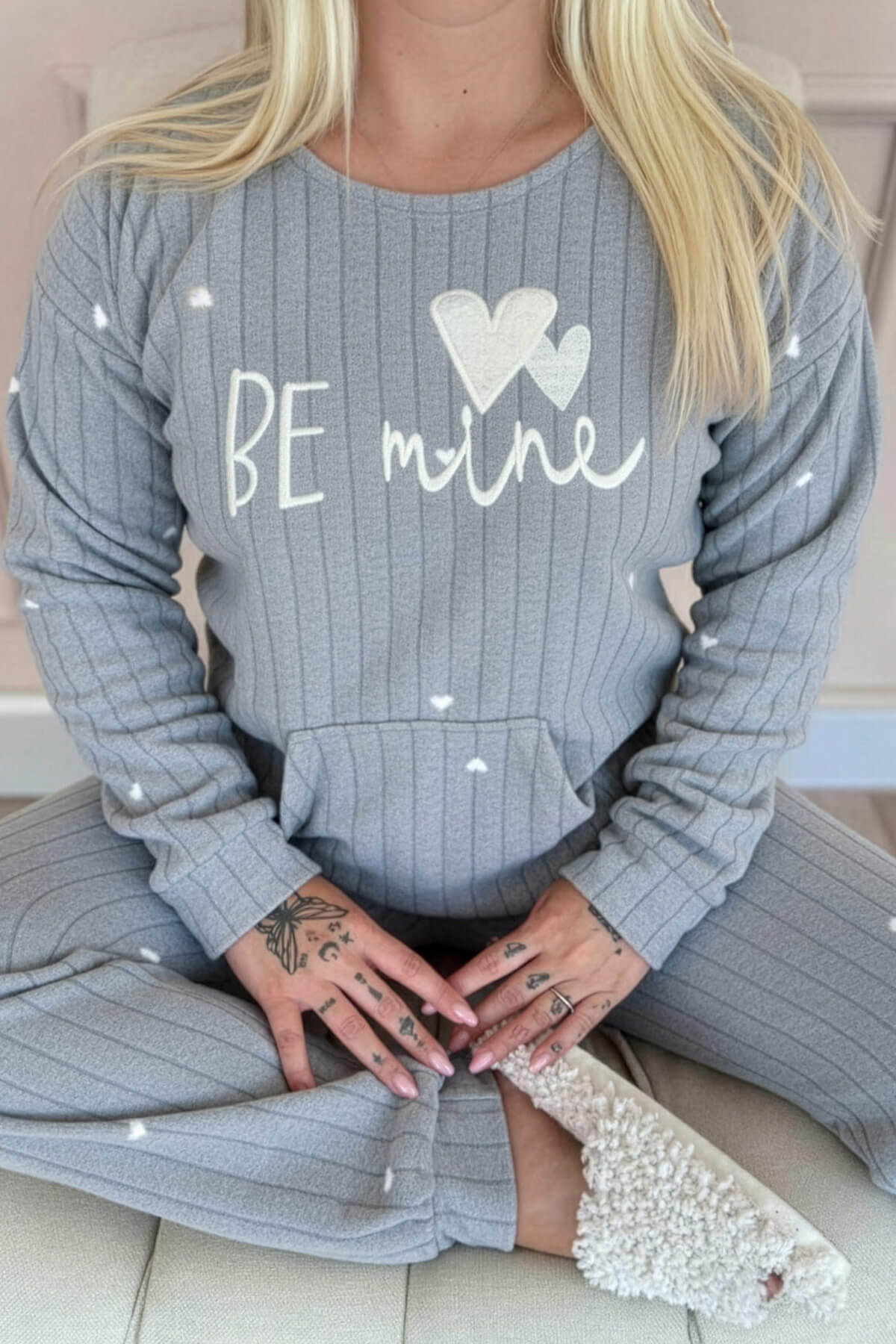 Antrsait Be Mine Desenli Kanguru Cepli Peluş Polar Pijama Takımı