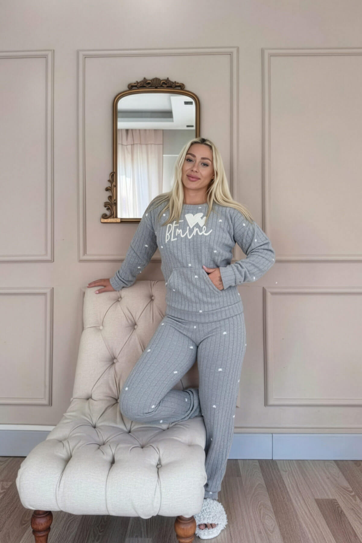 Ön kısmında yer alan kanguru cep detayı hem şıklık hem de fonksiyonellik kazandırır. Rahat kesimi sayesinde uyurken, evde dinlenirken veya keyifli anlarınızda maksimum konfor sağlar. Modern tasarımı, üzerindeki minimal desenler ve yazı detaylarıyla ev giyimine enerjik bir dokunuş katar. Soğuk günlerde hem şık görünmek hem de sıcacık hissetmek isteyen kadınların gardırobunda mutlaka bulunması gereken bir ev giyim takımıdır.