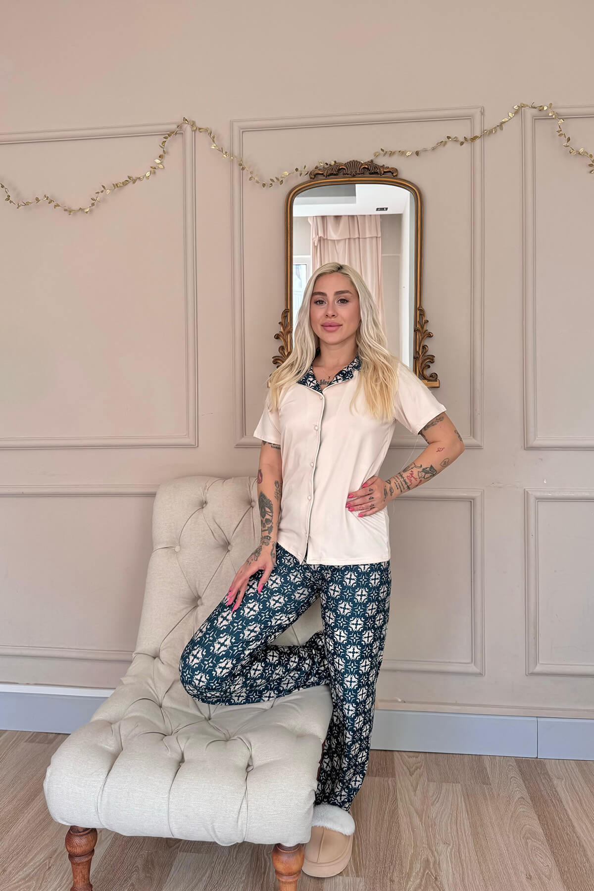 • Zarif detayları ve üstün kumaş kalitesiyle öne çıkan bu kadın pijama takımı, ev giyimini lüks bir deneyime dönüştürüyor. Kısa kollu, gömlek yakalı ve önden düğmeli üst tasarımı, klasik şıklığı modern rahatlıkla buluştururken; uzun paçalı alt parçası, konforu tamamlıyor. %30 Bambu, %60 Viskon ve %10 Elastan karışımı örme kumaşı, yumuşak tuşesiyle cildinize nazikçe dokunur ve nefes alabilir yapısıyla gece boyu ferahlık sağlar.