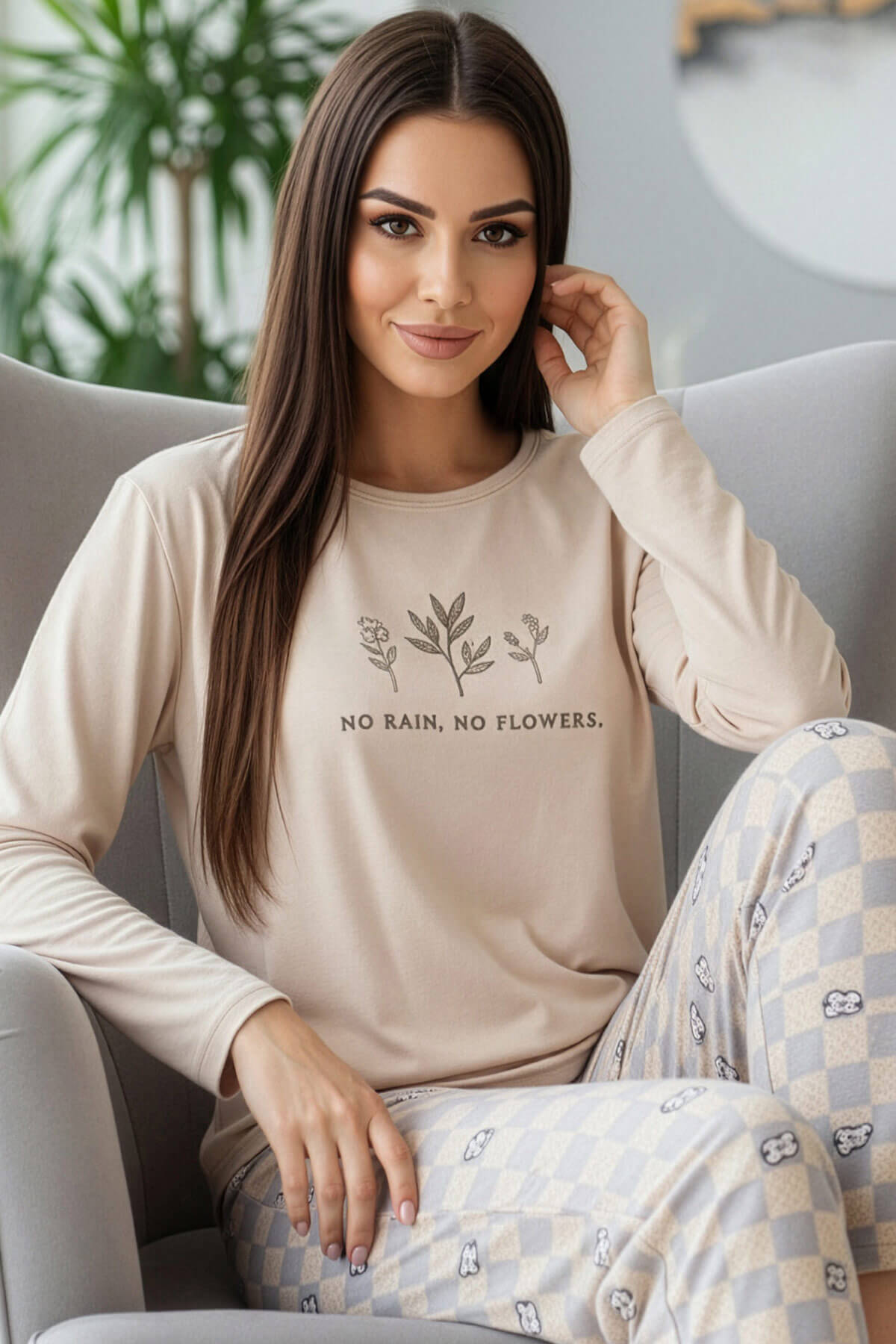 Gri Beautiful Desenli Uzun Kollu Bambu Örme Kadın Pijama Takımı