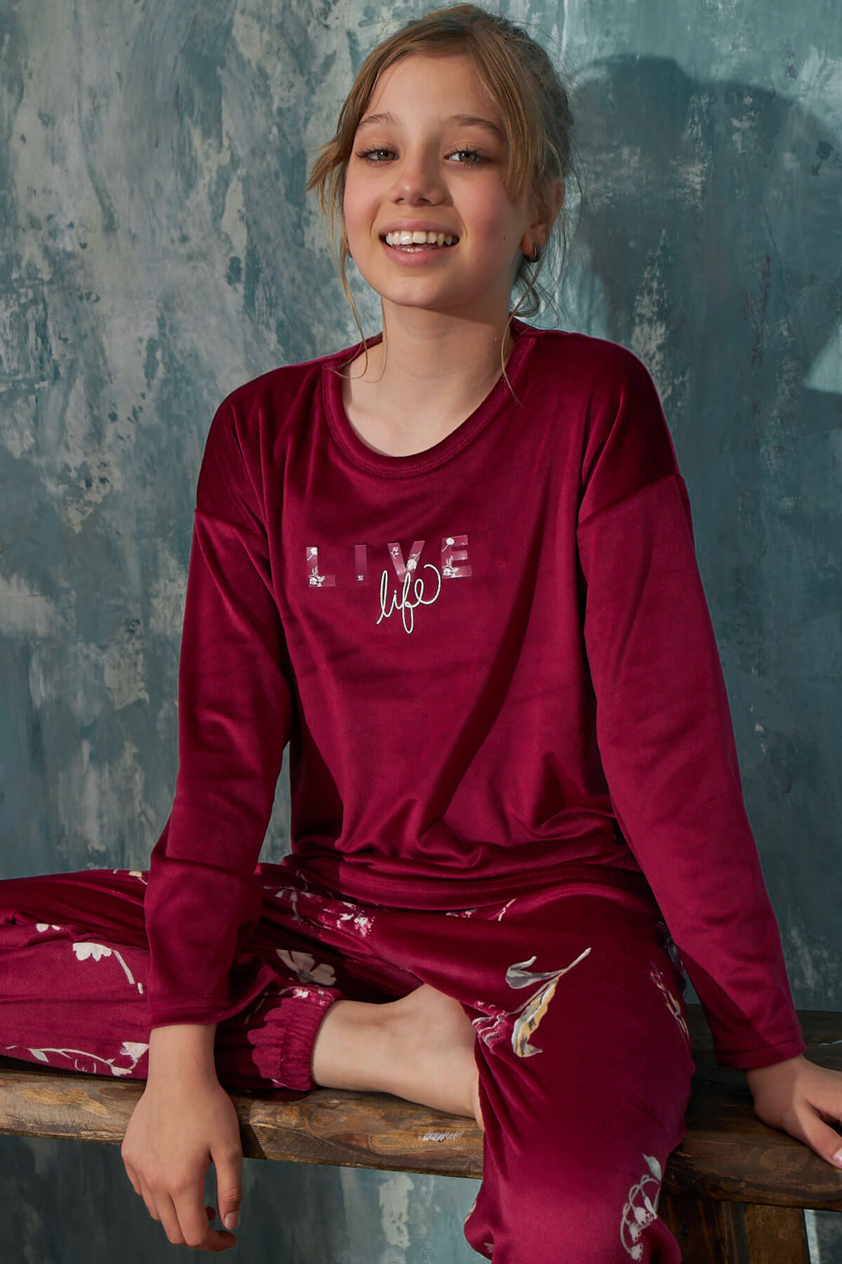 Bordo Life Desenli Exclusive Kadife Kız Çocuk Pijama Takımı