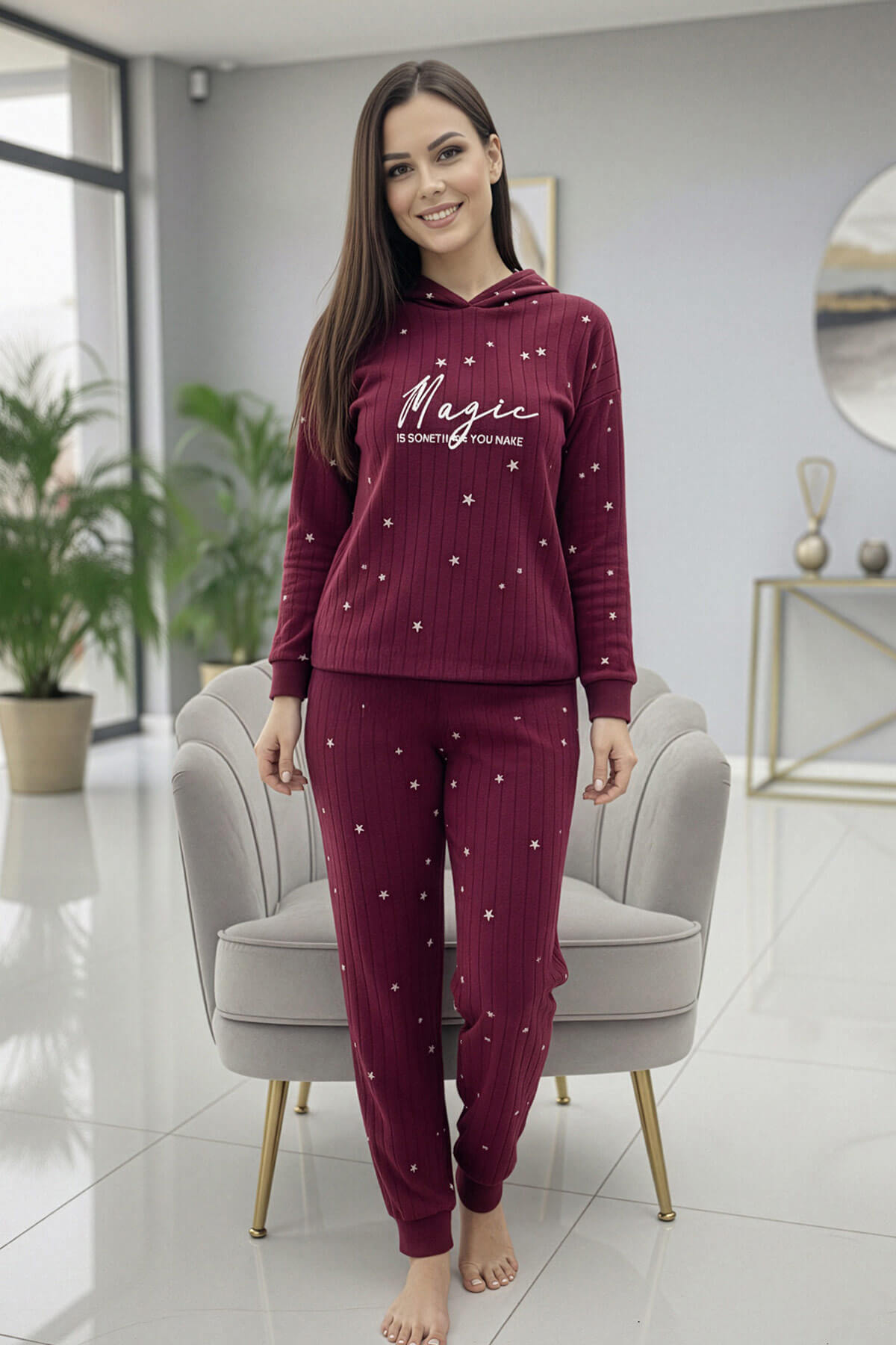 Bordo Magic Desenli Kapşonlu Peluş Polar Pijama Takımı