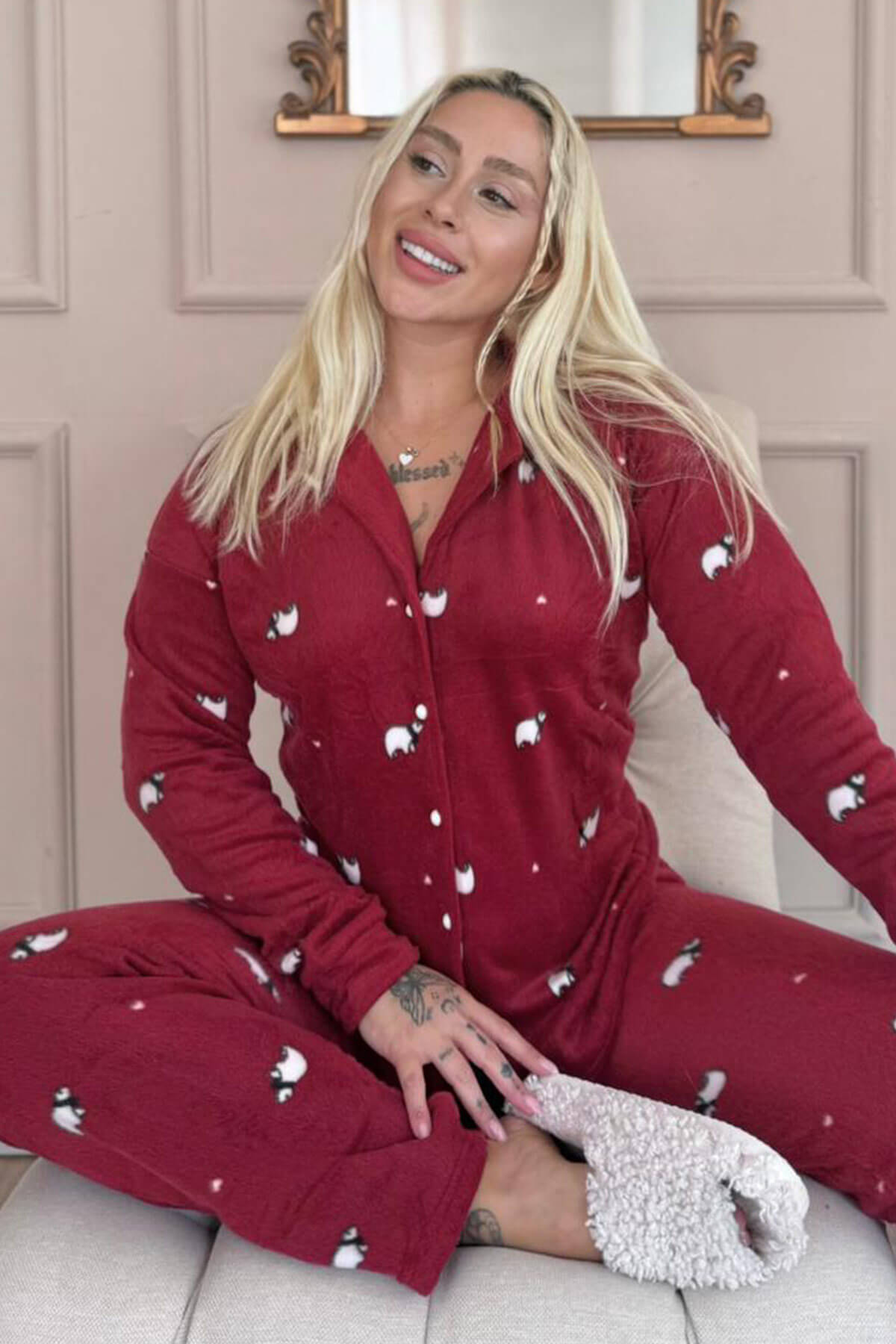 Bordo Panda Desenli Önden Düğmeli Peluş Polar Pijama Takımı