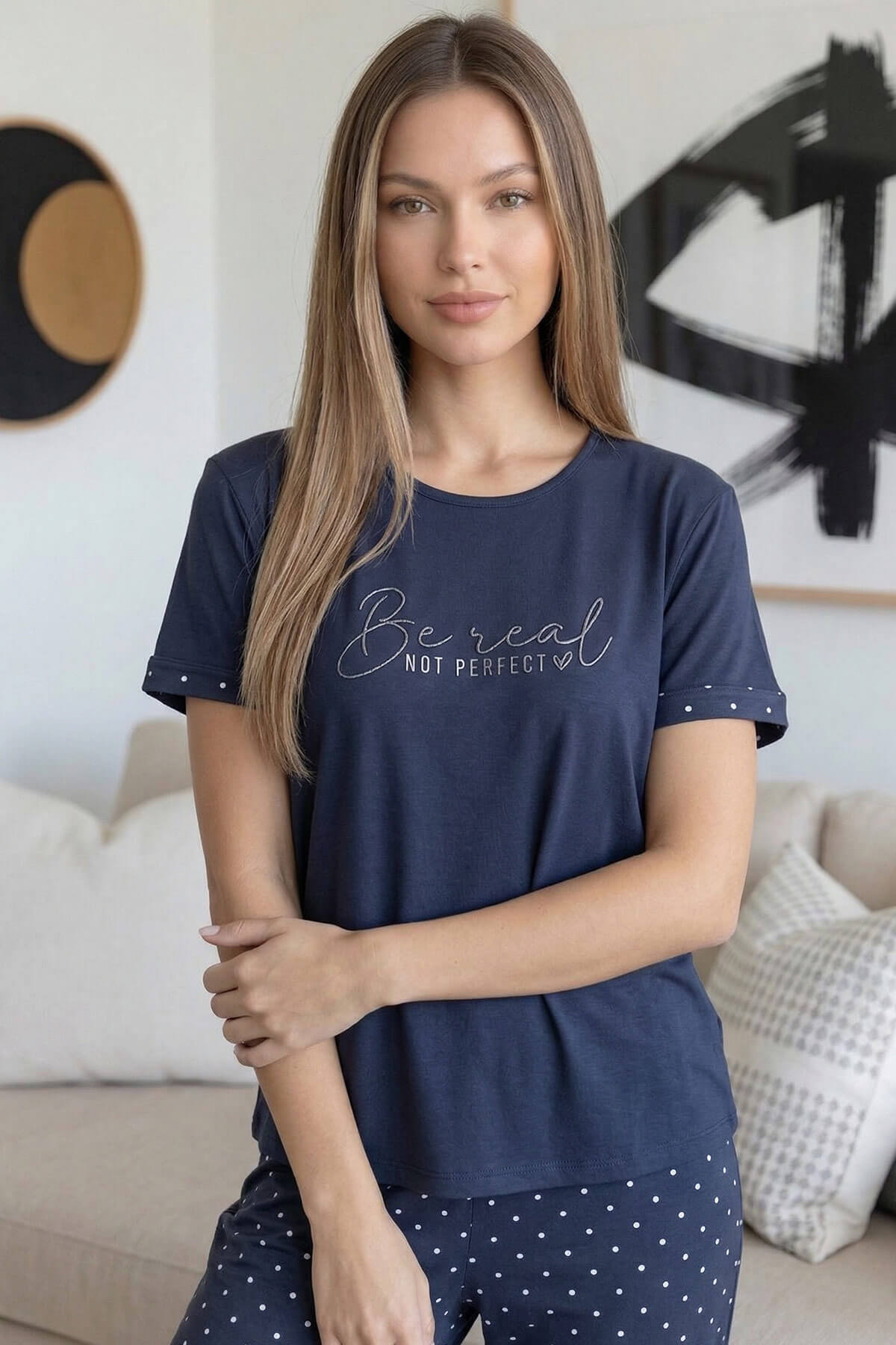 Kısa kollu bisiklet yaka üst tasarımı modern ve sade bir görünüm sunarken; uzun alt pijama rahat kalıbı ile hareket özgürlüğü sağlar. Ev giyimi, uyku ve günlük kullanım için ideal olan bu takım, yumuşak tuşesi sayesinde cilde nazik temas eder.