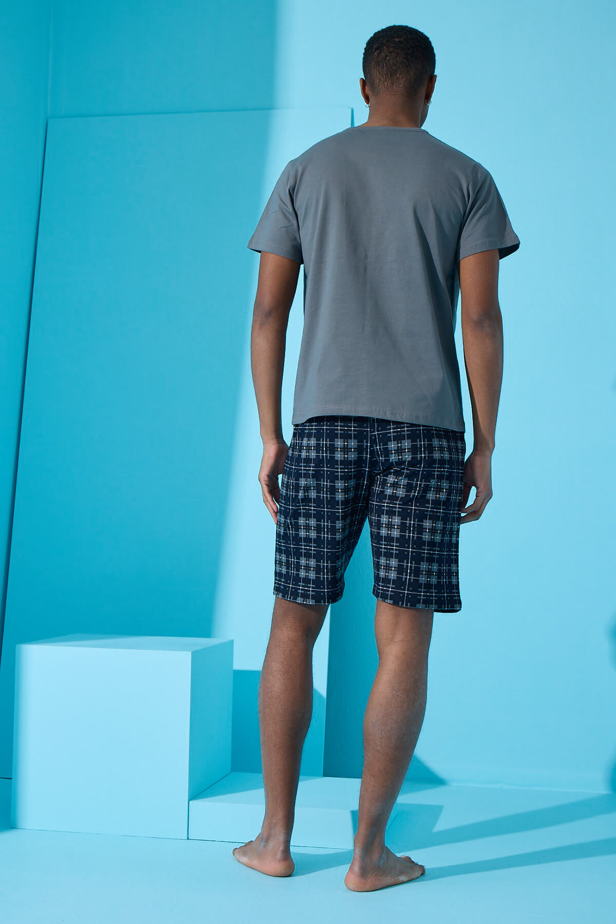Lacivert Ekose Cep Detaylı Şortlu Kısa Kollu Erkek Pijama Takımı