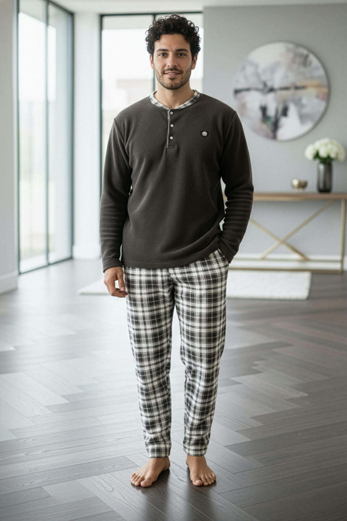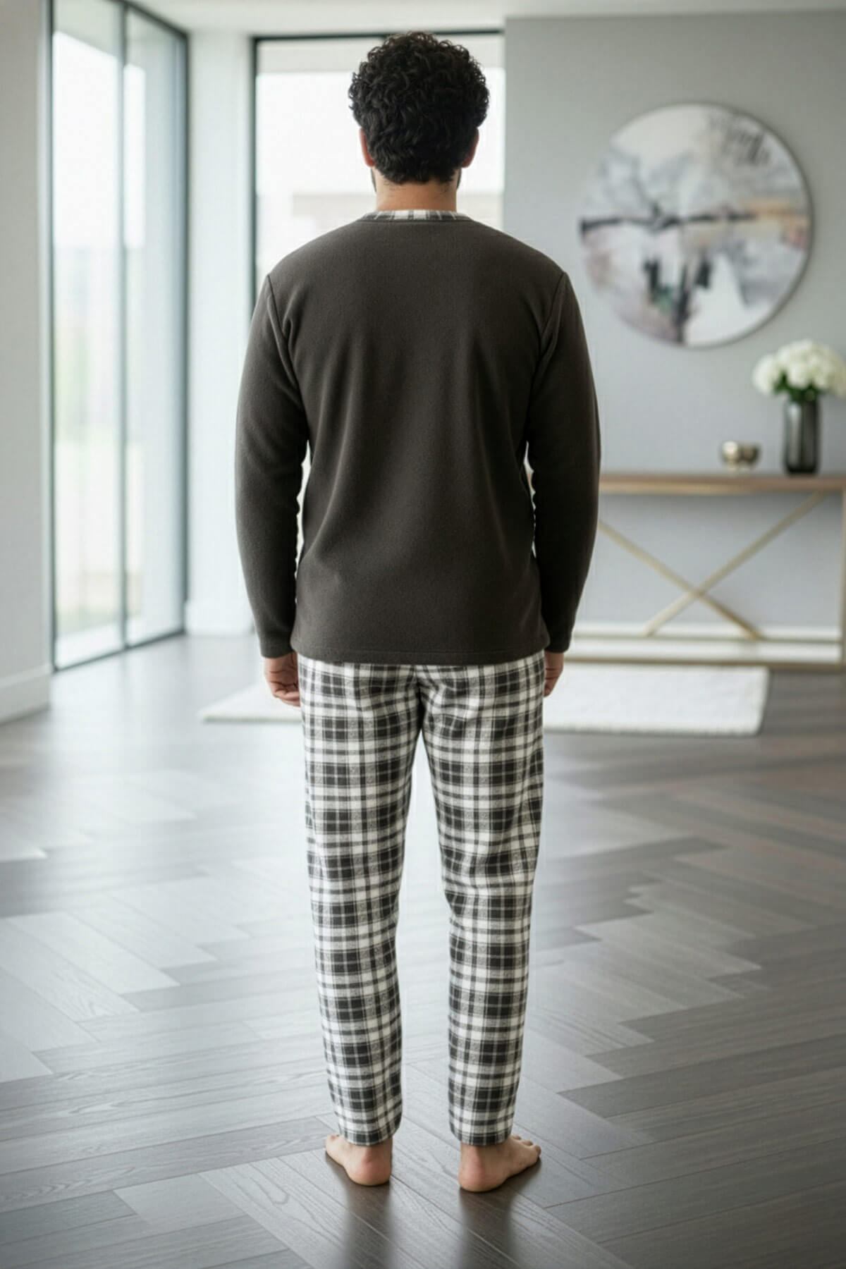 Füme Kahve Ekose Desenli Polar Erkek Pijama Takımı