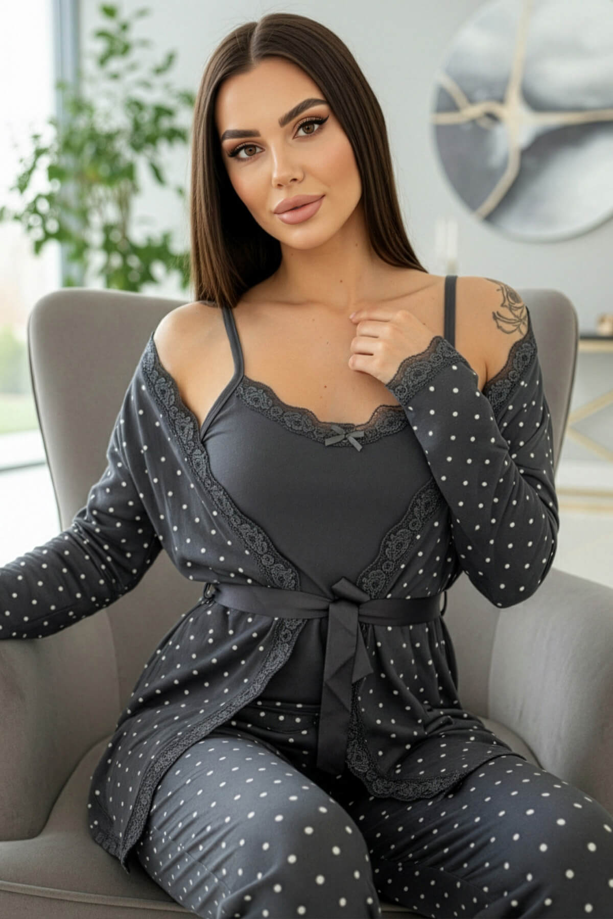 Füme Mini Puan Desenli Bambu Sabahlıklı Kadın Pijama Takımı - 1