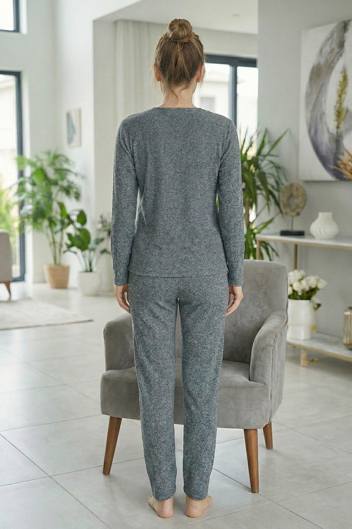 • Yumuşak dokulu kumaşıyla gün boyu konfor sunan kadın pijama takımı, uzun kollu üst ve uzun paça alt tasarımıyla mevsimlik kullanım için idealdir. Regular kesimi sayesinde rahat bir kalıp sunar. Ev giyimi ve uyku için uygundur.