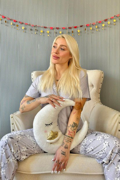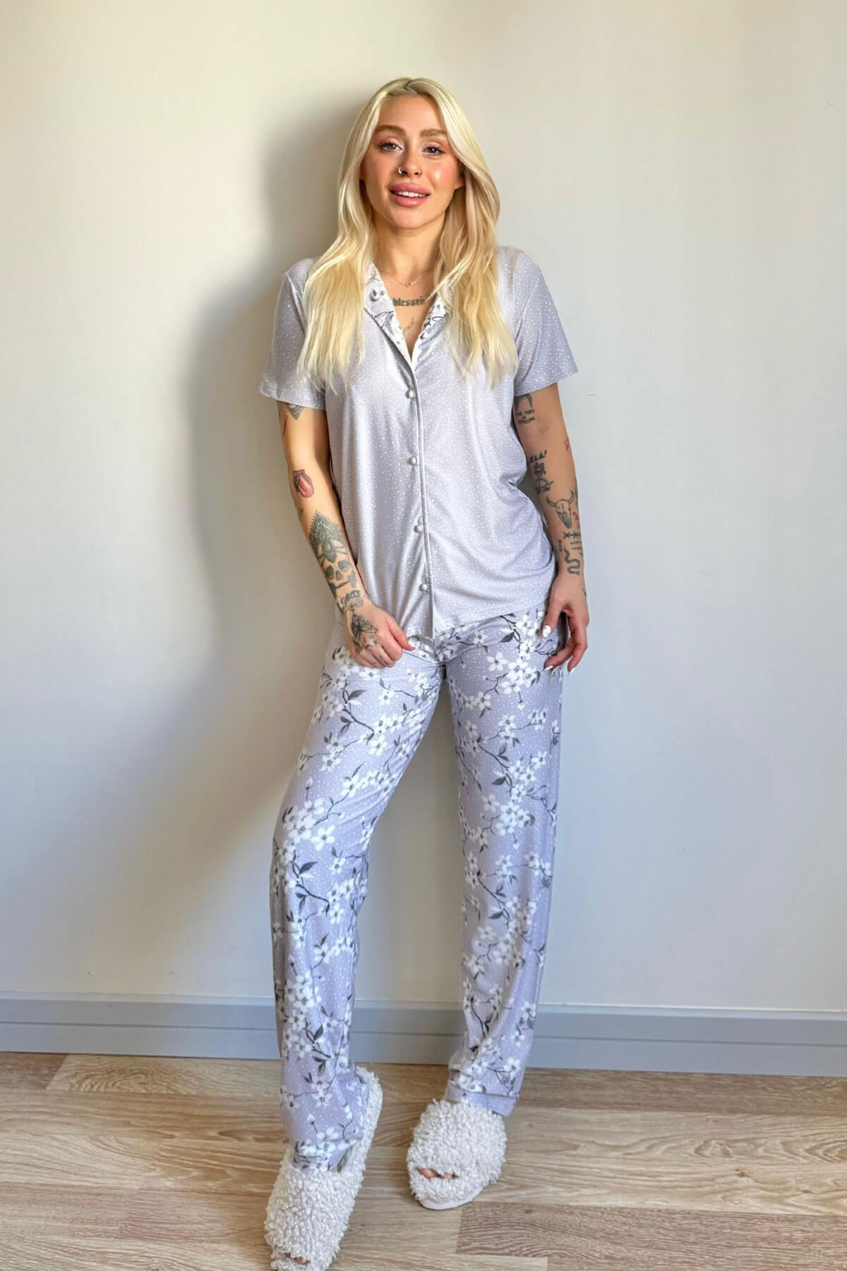 Gri Florado Exclusive Önden Düğmeli Kısa Kollu Kadın Pijama Takımı