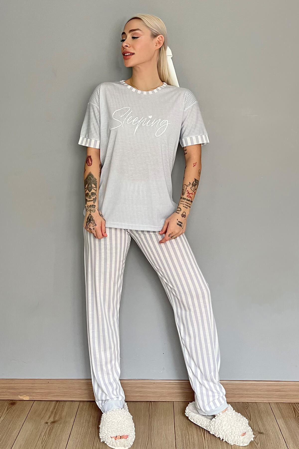 Gri Sleeping Baskılı Örme Kısa Kollu Kadın Pijama Takımı