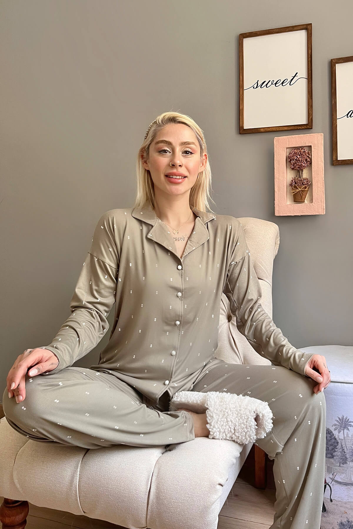 Haki Double Desenli Bambu Önden Düğmeli Kadın Pijama Takımı