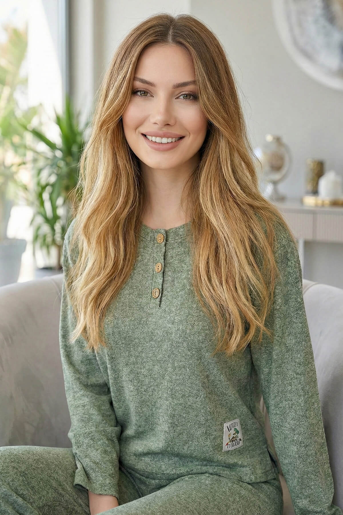 Haki Happy Desenli Uzun Kollu Seul Örme Kadın Pijama Takımı