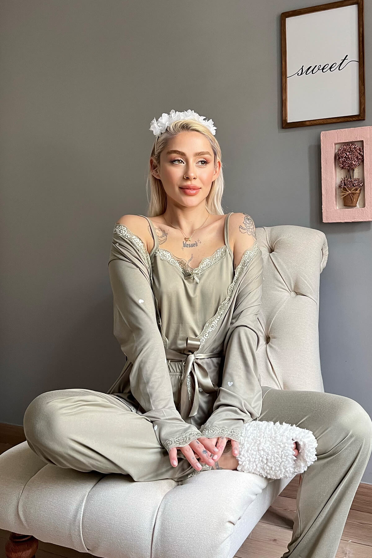 Haki Heart Desenli Bambu Sabahlıklı Kadın Pijama Seti - 1