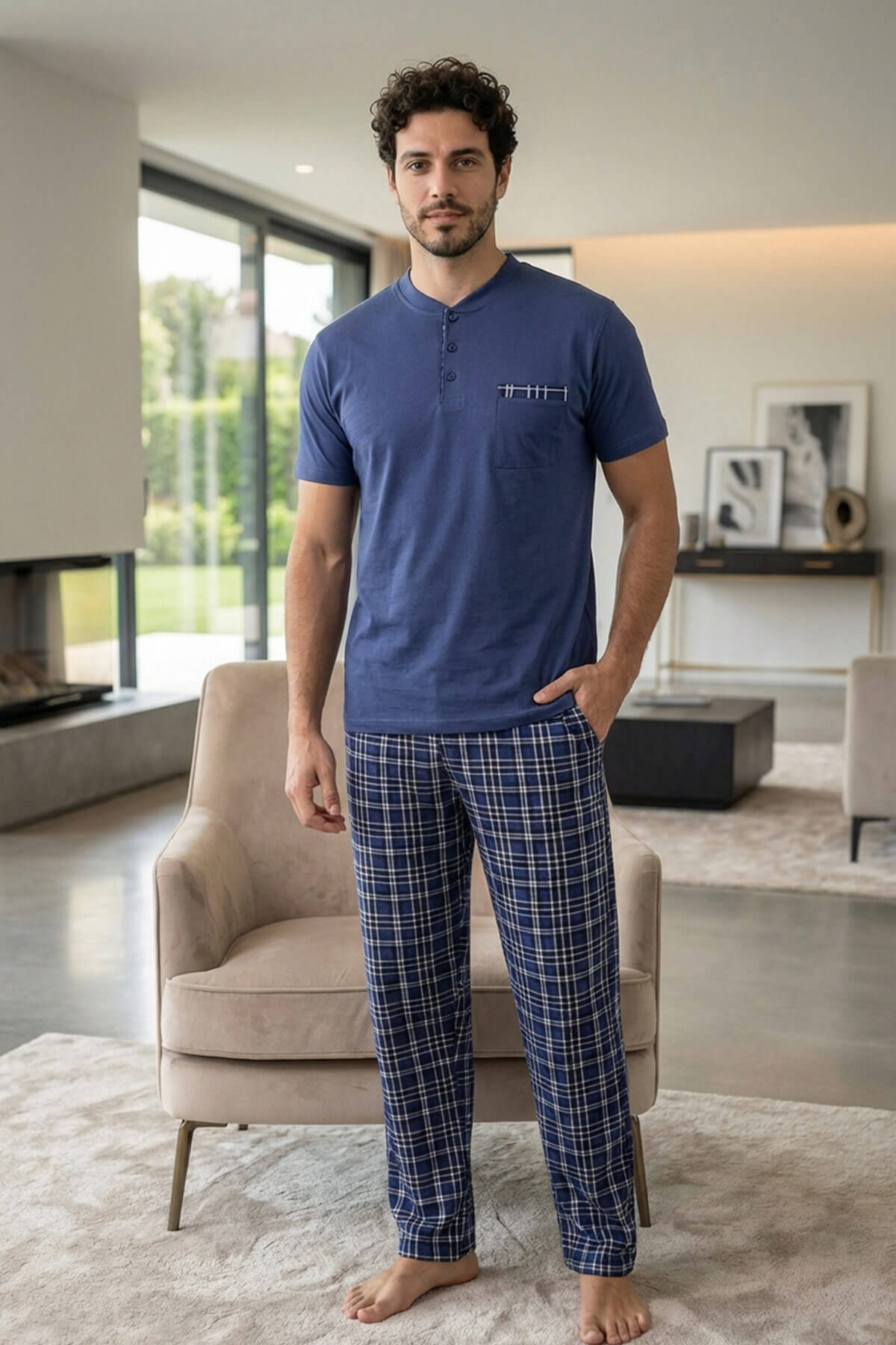 Pijamaevi Premium Erkek Pijama Takımı, özenle seçilmiş %100 pamuk kumaşı ve kaliteli işçiliği ile ev giyiminde fark yaratır. Nefes alabilen yapısı sayesinde yaz aylarında terletmez, gün boyu ferah ve rahat bir kullanım sunar.