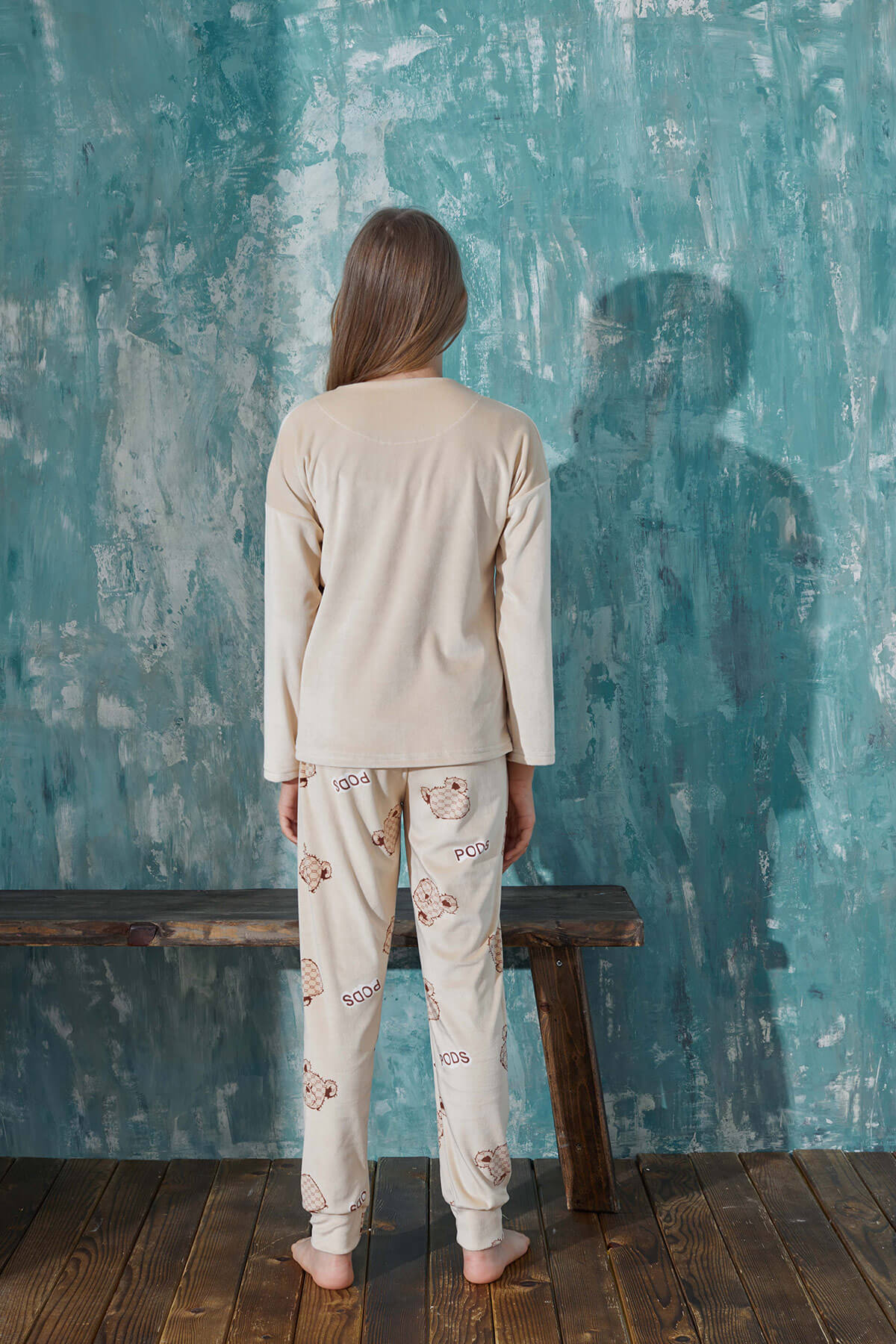 Kahve Bear Head Desenli Exclusive Kadife Kız Çocuk Pijama Takımı