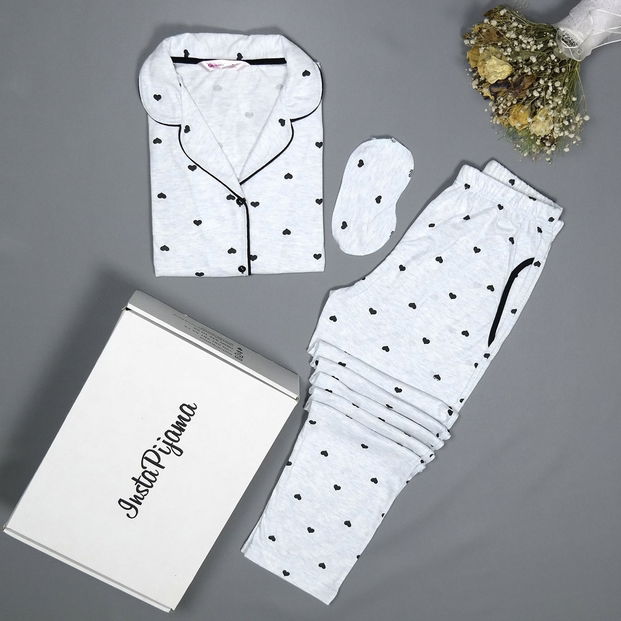 Kalp Desenli Önden Düğmeli Kısa Kollu Pijama Takımı