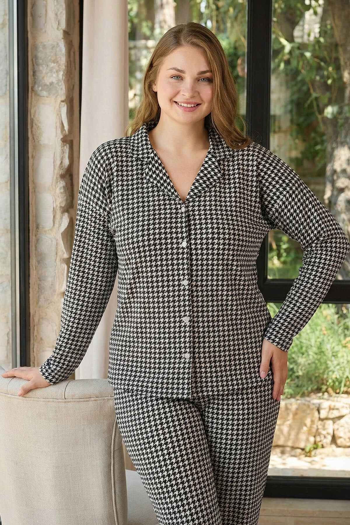 Uzun kollu, önden düğmeli üst pijaması ve uzun paça alt pijamasıyla mevsimlik kullanıma uygundur. Büyük beden için özel hazırlanmış kalıbı sayesinde vücudu sıkmadan rahat bir duruş sağlar. Özenli dikiş detayları ve kaliteli kumaş yapısı ile formunu uzun süre korur. Hem şıklığı hem de konforu bir arada isteyenler için ideal bir ev giyimi alternatifidir.