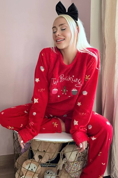 Kırmızı Baking Desenli Kadın Peluş Pijama Takımı