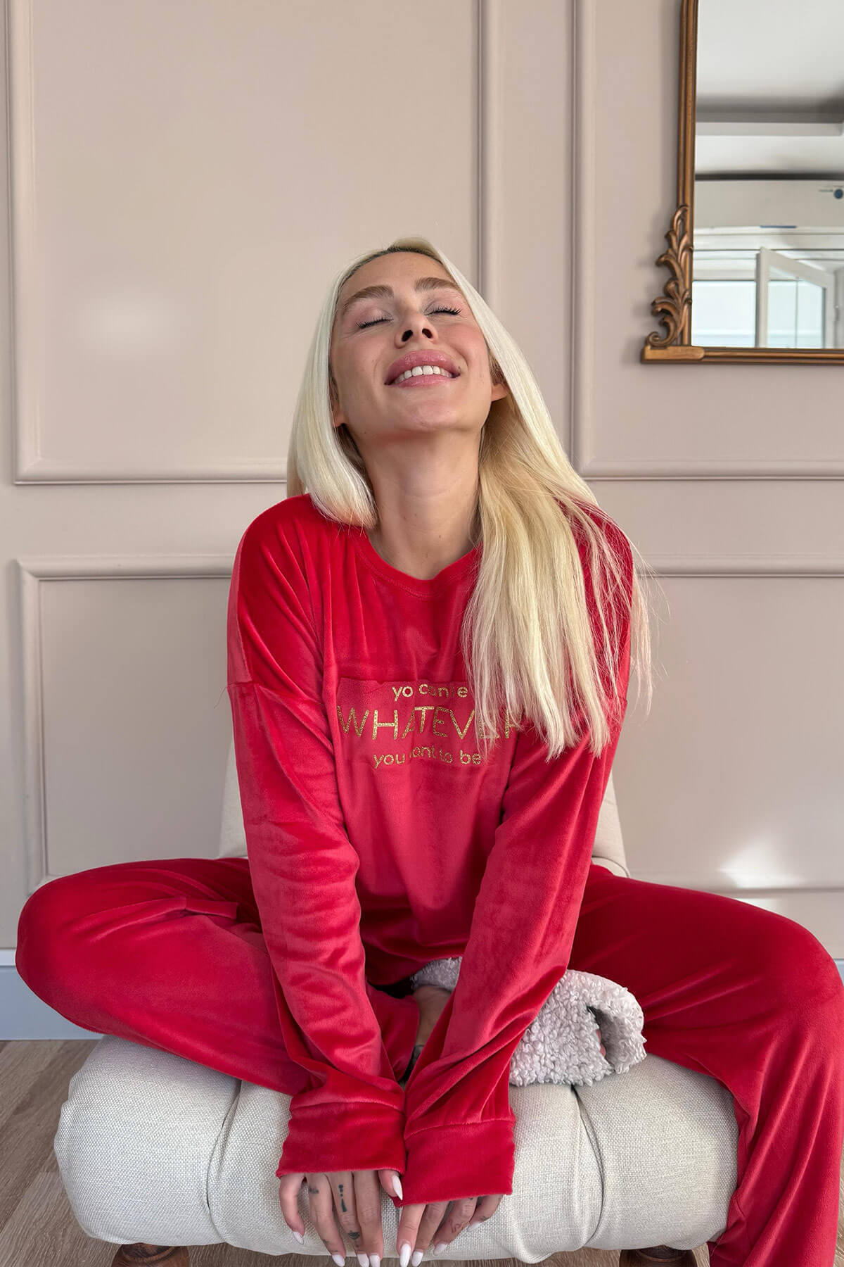 Kırmızı Whatever Desenli Exclusive Kadife Kadın Pijama Takımı