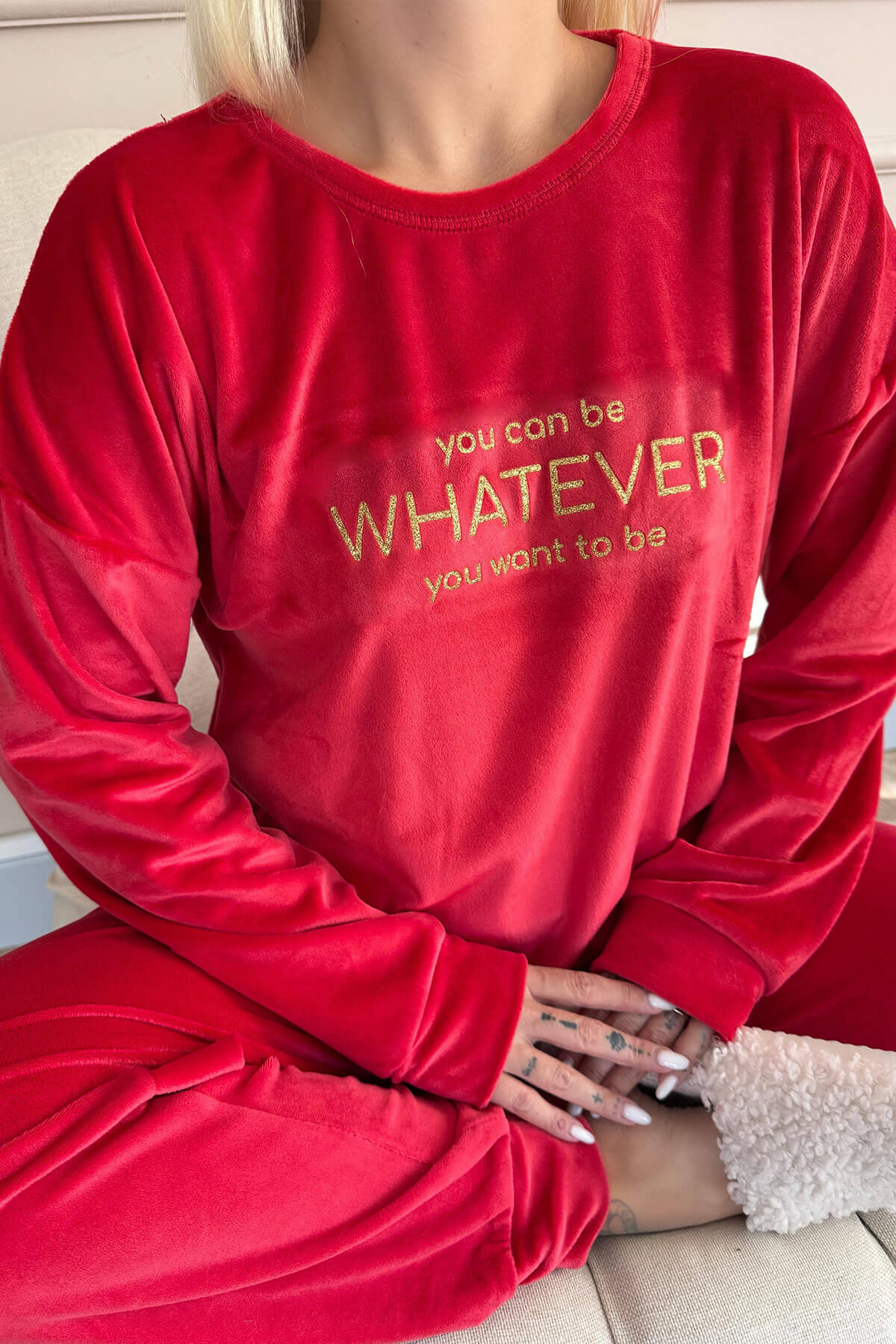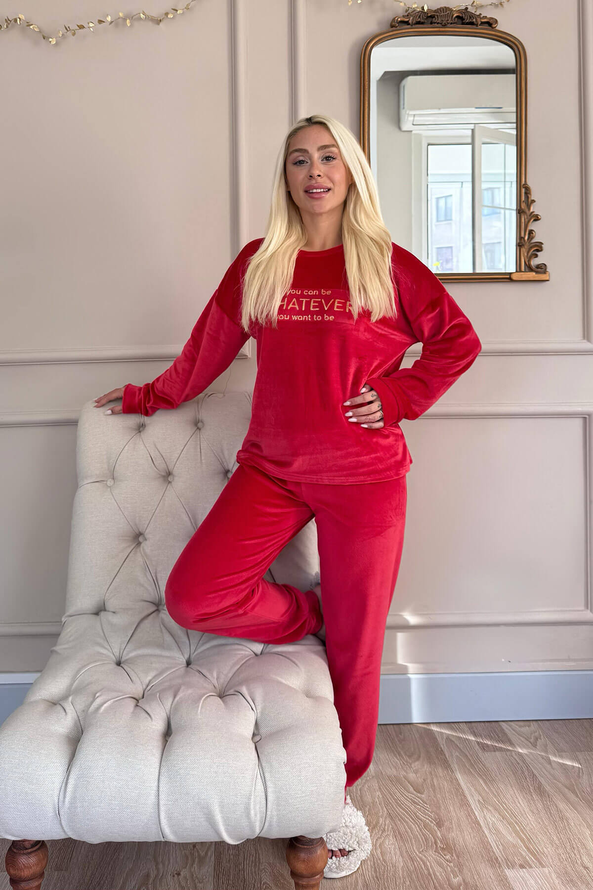 Kırmızı Whatever Desenli Exclusive Kadife Kadın Pijama Takımı  - 1