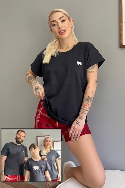 Füme Bear Şortlu Sevgili Aile Pijaması - Kadın Takımı