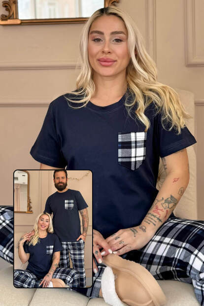 Lacivert Cep Detay Kısa Kol Sevgili Aile Pijaması - Kadın Takımı
