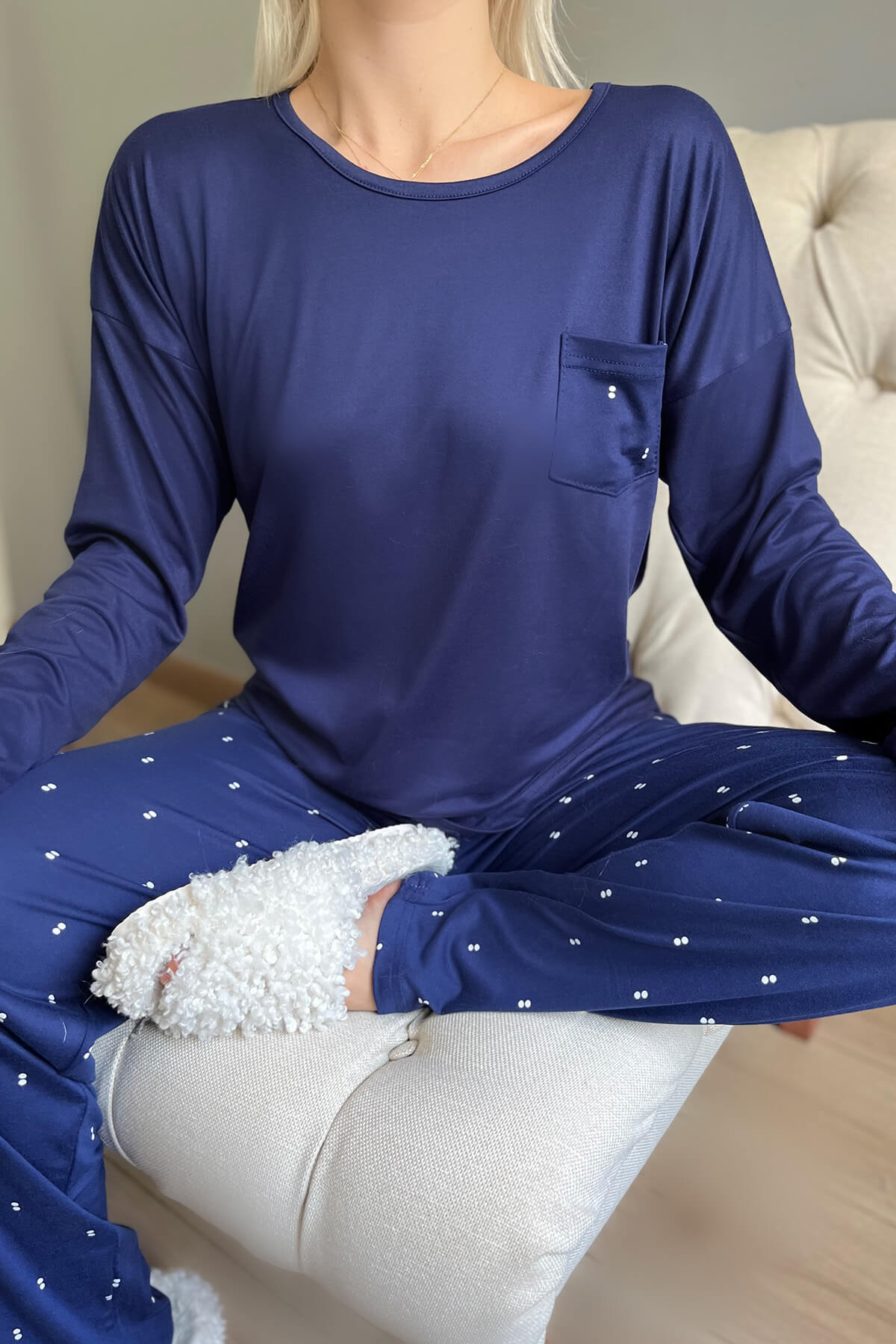 Lacivert Double Desenli Bambu Uzun Kol Kadın Pijama Takımı