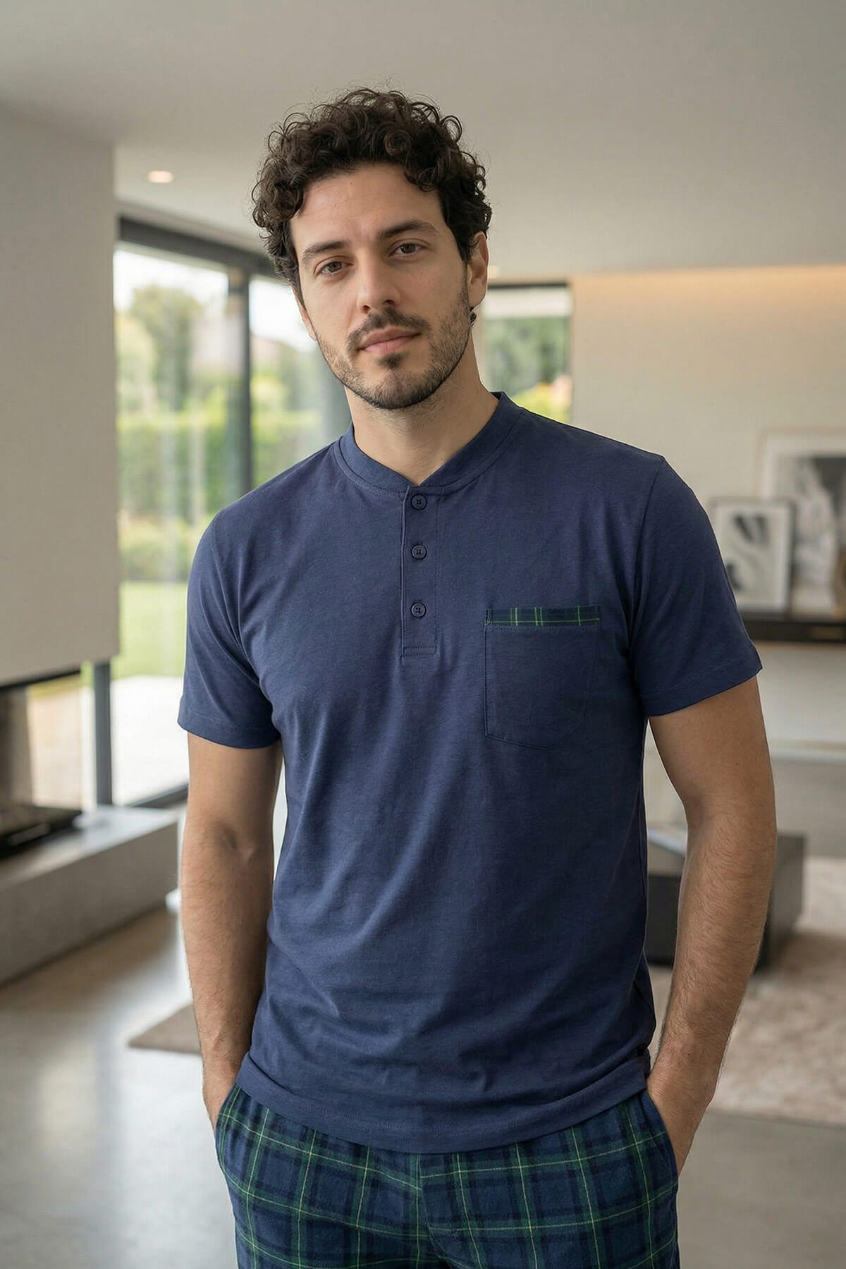 • Erkekler için konfor ve stilin bir araya geldiği Premium Mevsimlik Erkek Pijama Takımı, lüks dokusu ve kaliteli kumaşıyla üst segment ev giyimi deneyimi sunar. %100 pamuk kumaşı, nefes alabilir yapısıyla cildinize yumuşak bir dokunuş sağlar. Patlı kısa kollu üst pijama ve Şortlu ekose alt pijama tasarımıyla hem klasik hem de modern bir görünüm sunan bu set, premium pijama arayan erkekler için mükemmel bir seçimdir.