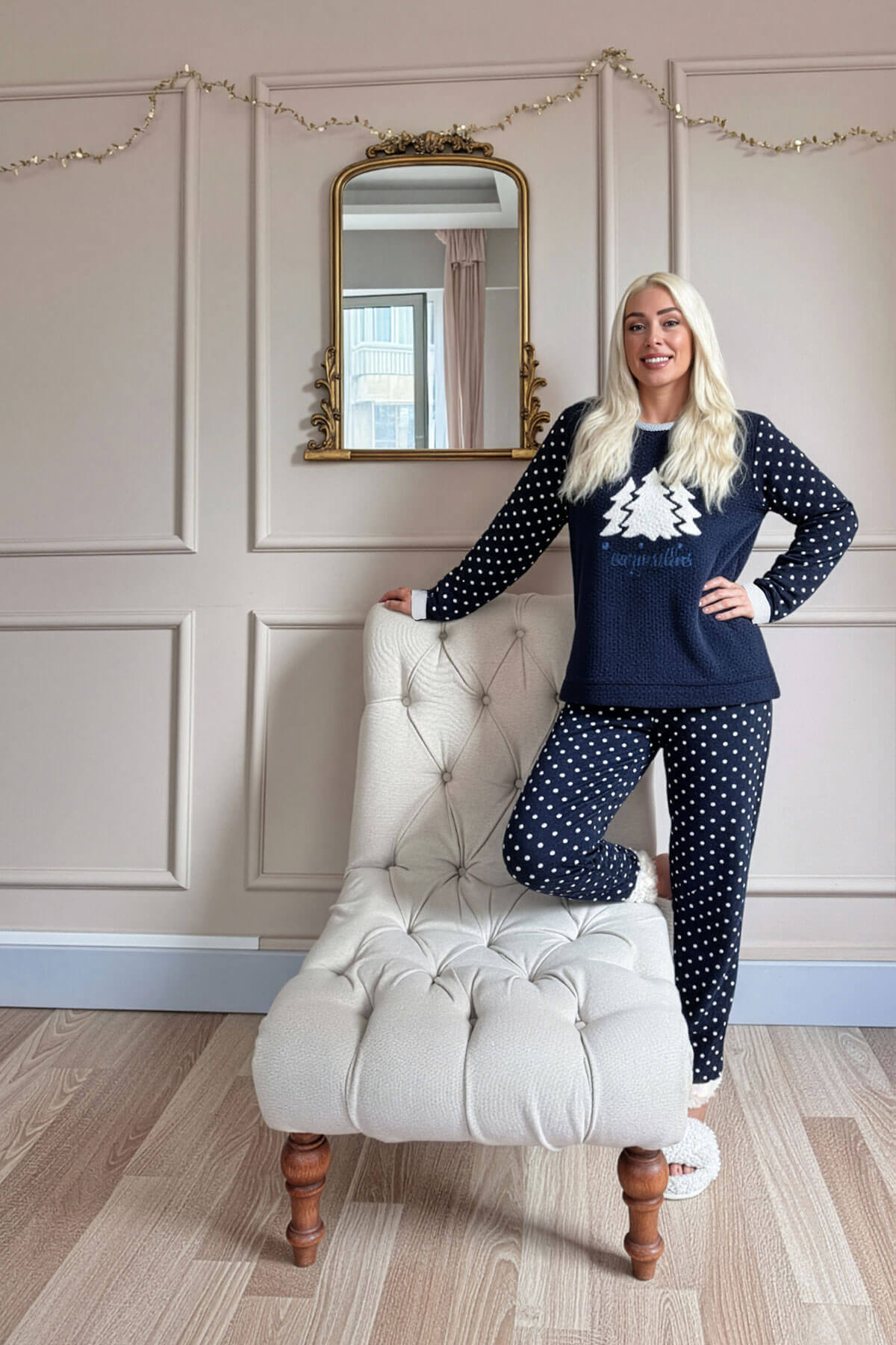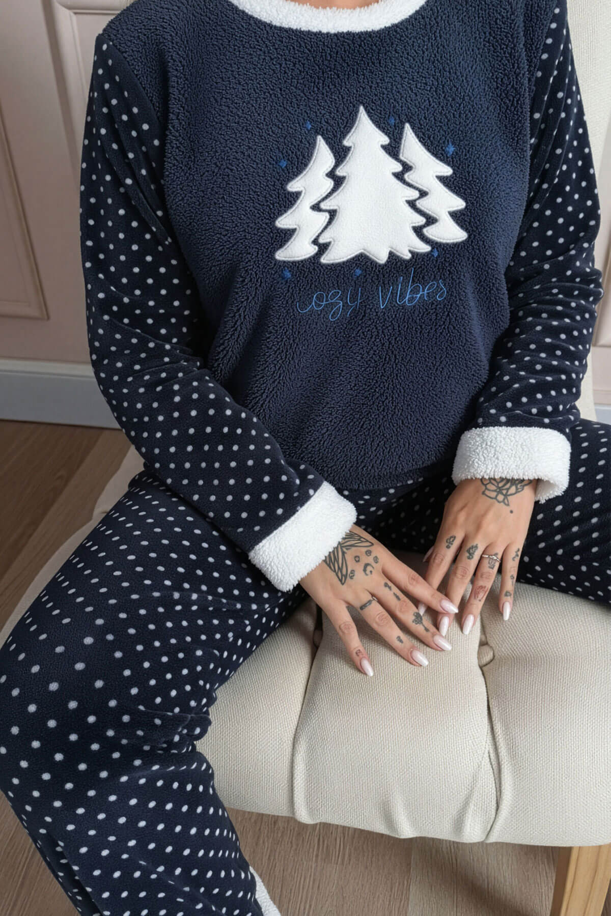 Lacivert Pine Tree Desenli Kadın Peluş Pijama Takımı