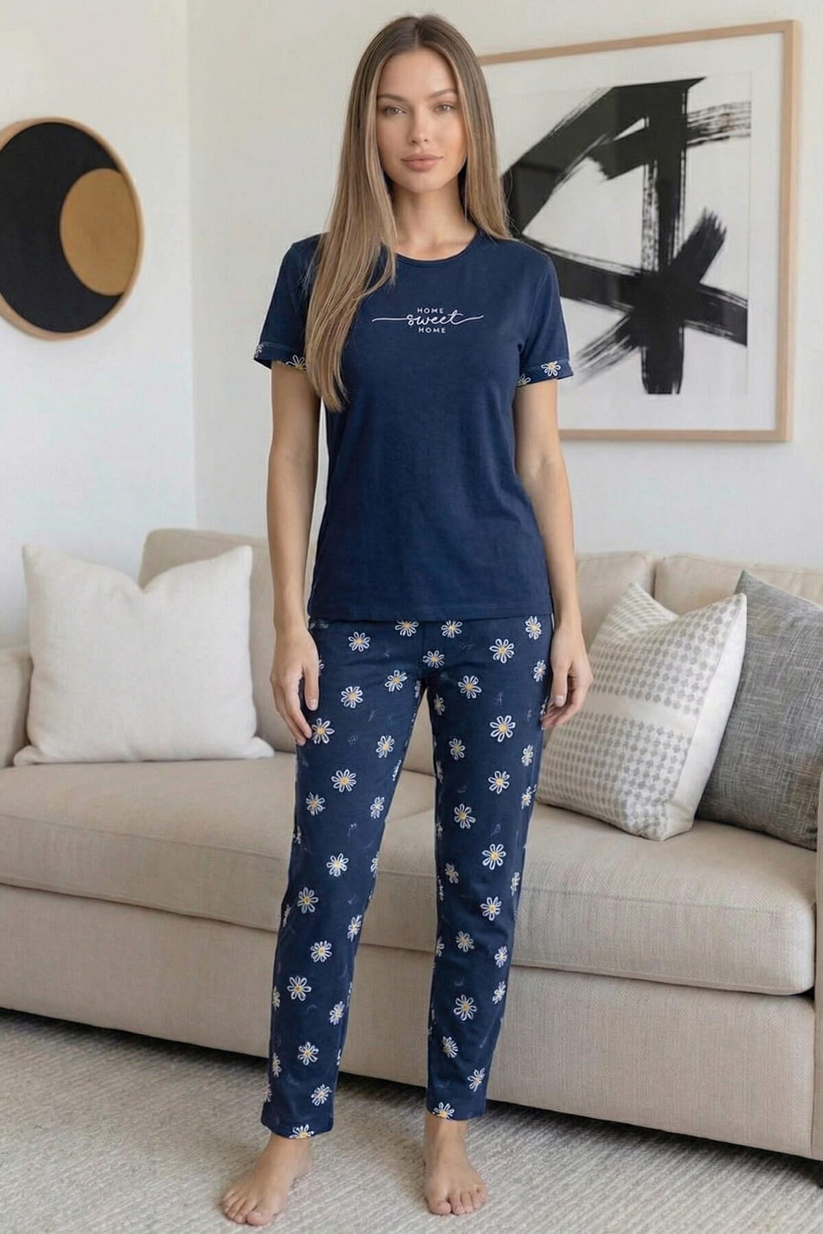 Kısa kollu bisiklet yaka üst tasarımı modern ve sade bir görünüm sunarken; uzun alt pijama rahat kalıbı ile hareket özgürlüğü sağlar. Ev giyimi, uyku ve günlük kullanım için ideal olan bu takım, yumuşak tuşesi sayesinde cilde nazik temas eder.