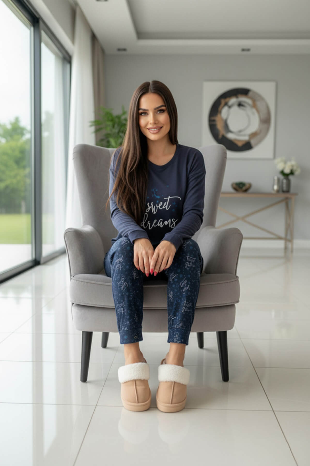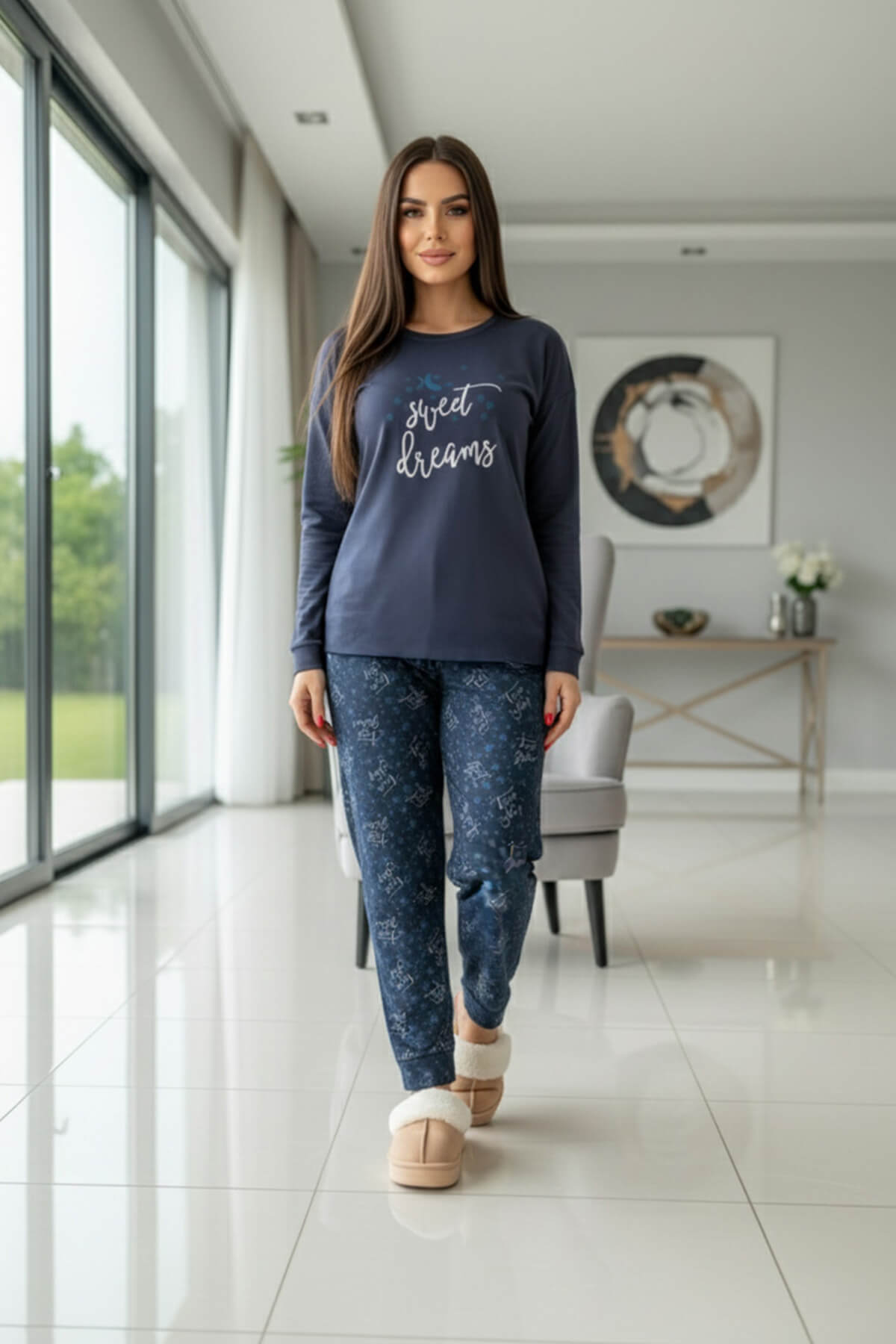 Yumuşak tuşesi sayesinde cilde nazikçe dokunan kumaşı, gün boyu rahat bir his sunarken desenli alt parçalarıyla da enerjik ve modern bir görünüm kazandırır. Sonbahar-kış kullanıma uygun yapısıyla gardırobunuzun vazgeçilmez parçalarından biri olacak.Gündelik ev şıklığı için ideal olan bu pijama takımı, rahatlığı ve tarzı bir arada sunuyor.