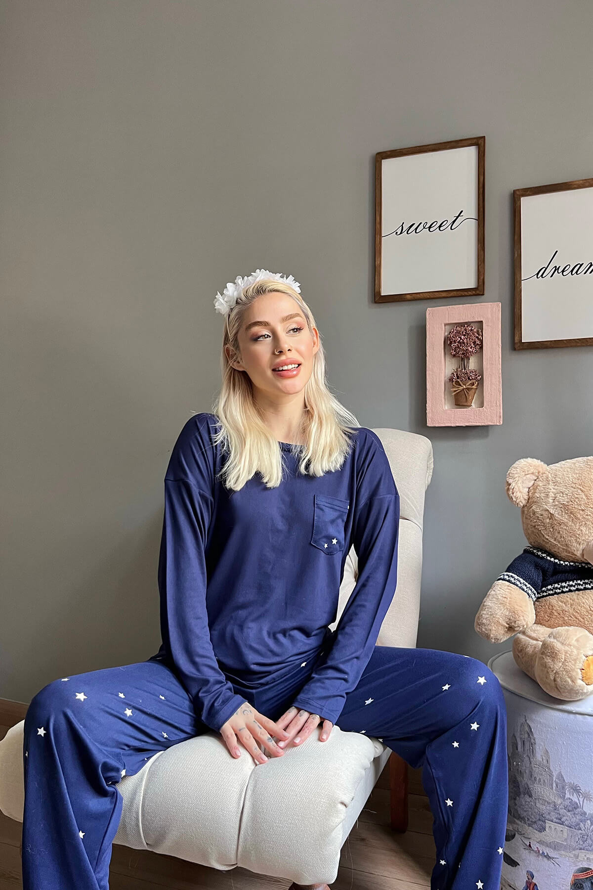 Lacivert Yıldız Desenli Bambu Uzun Kol Kadın Pijama Takımı