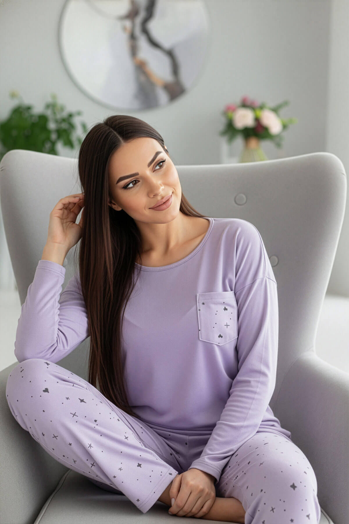 Lavanta Kalp Yılzdız Desenli Uzun Kollu Bambu Örme Kadın Pijama Takımı