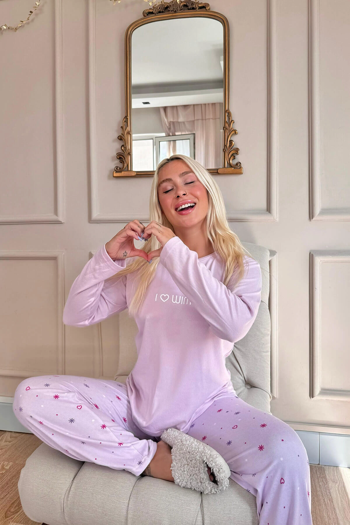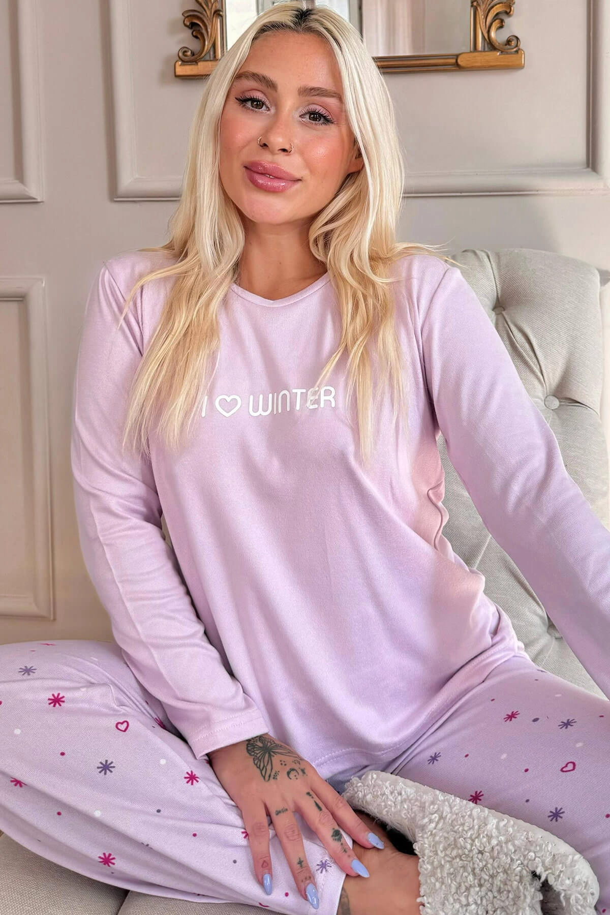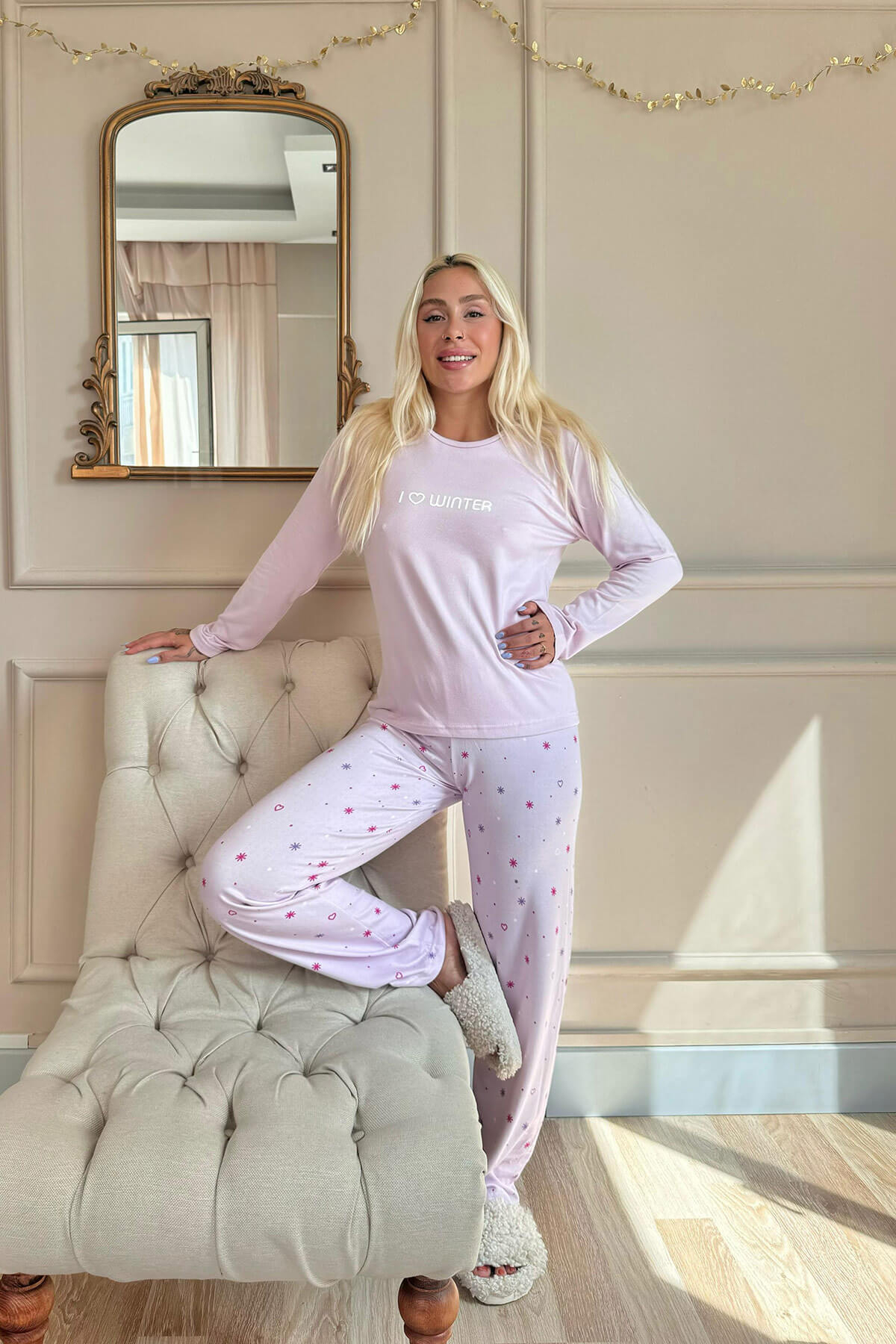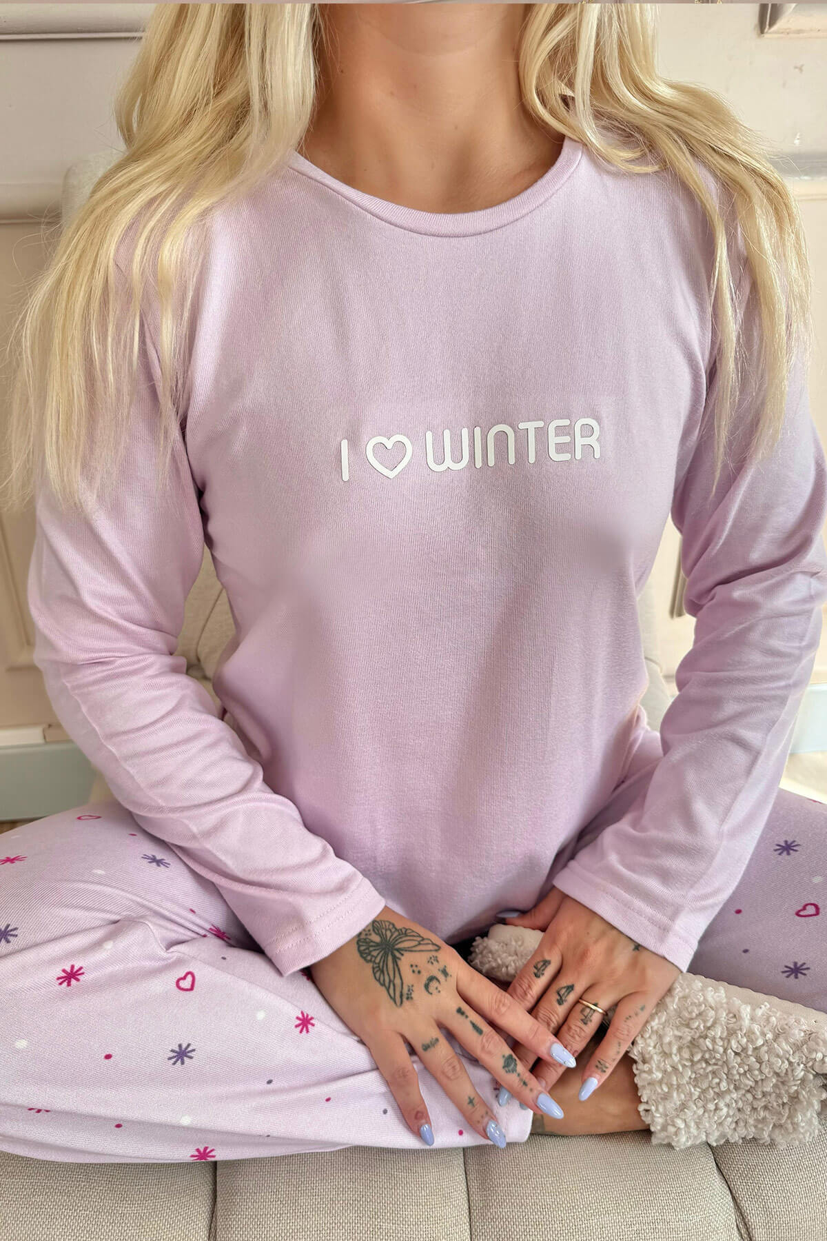 Gelince Haber VerKış aylarının vazgeçilmezi olacak Pijamaevi Kadın Lila Kış Desenli Termal Pijama Takımı, soğuk günlerde sizi sıcacık tutacak. Üst kısmında "I Love Winter" nakış detayı bulunurken, alt pijamada sevimli kar tanesi ve yıldız desenleri yer alıyor. Yumuşak ve nefes alabilen termal kumaşı ile vücut ısınızı koruyarak rahat bir uyku sağlar. Gün boyu konfor için tasarlanan bu pijama takımı, kış ruhunu evinize taşır.