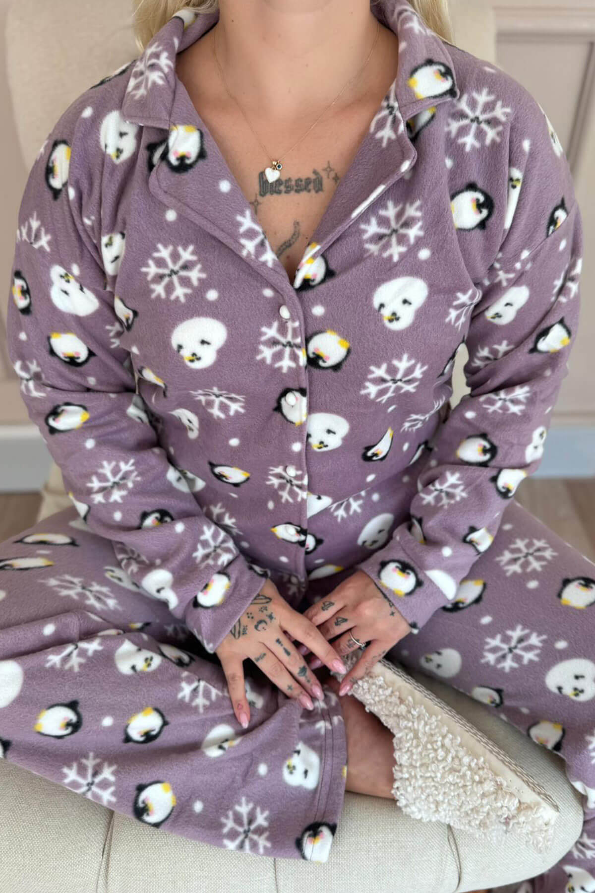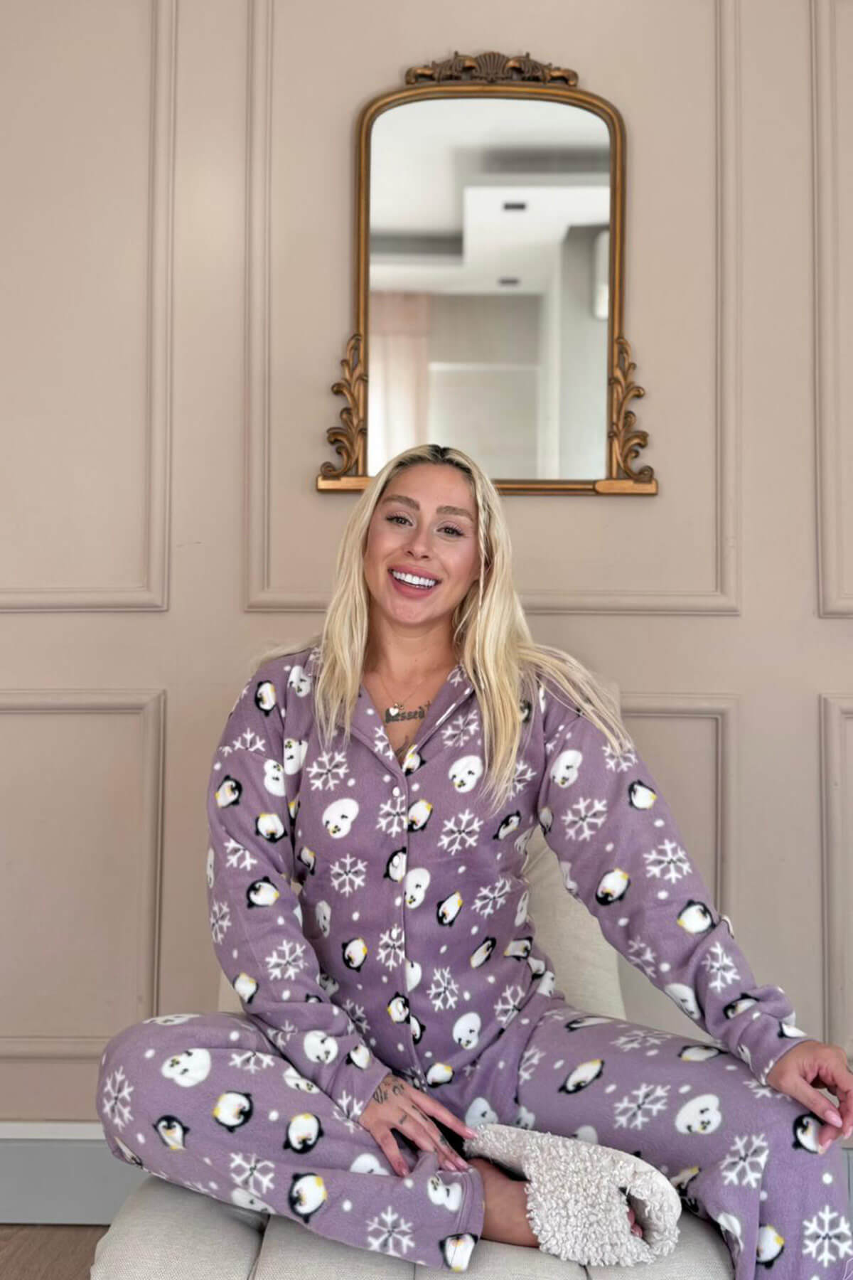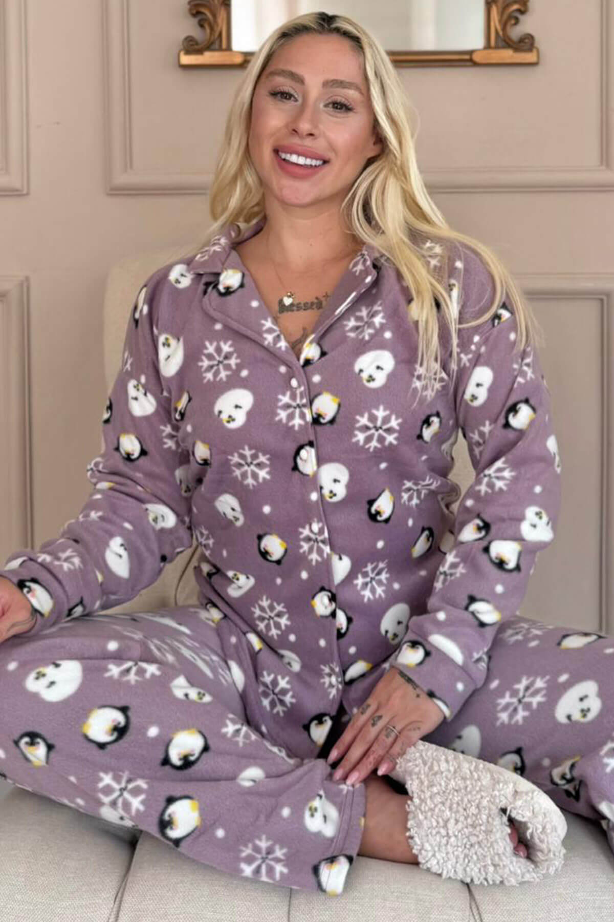 Lila Penguen Desenli Önden Düğmeli Peluş Polar Pijama Takımı