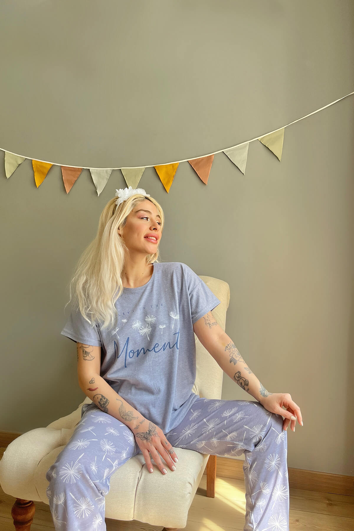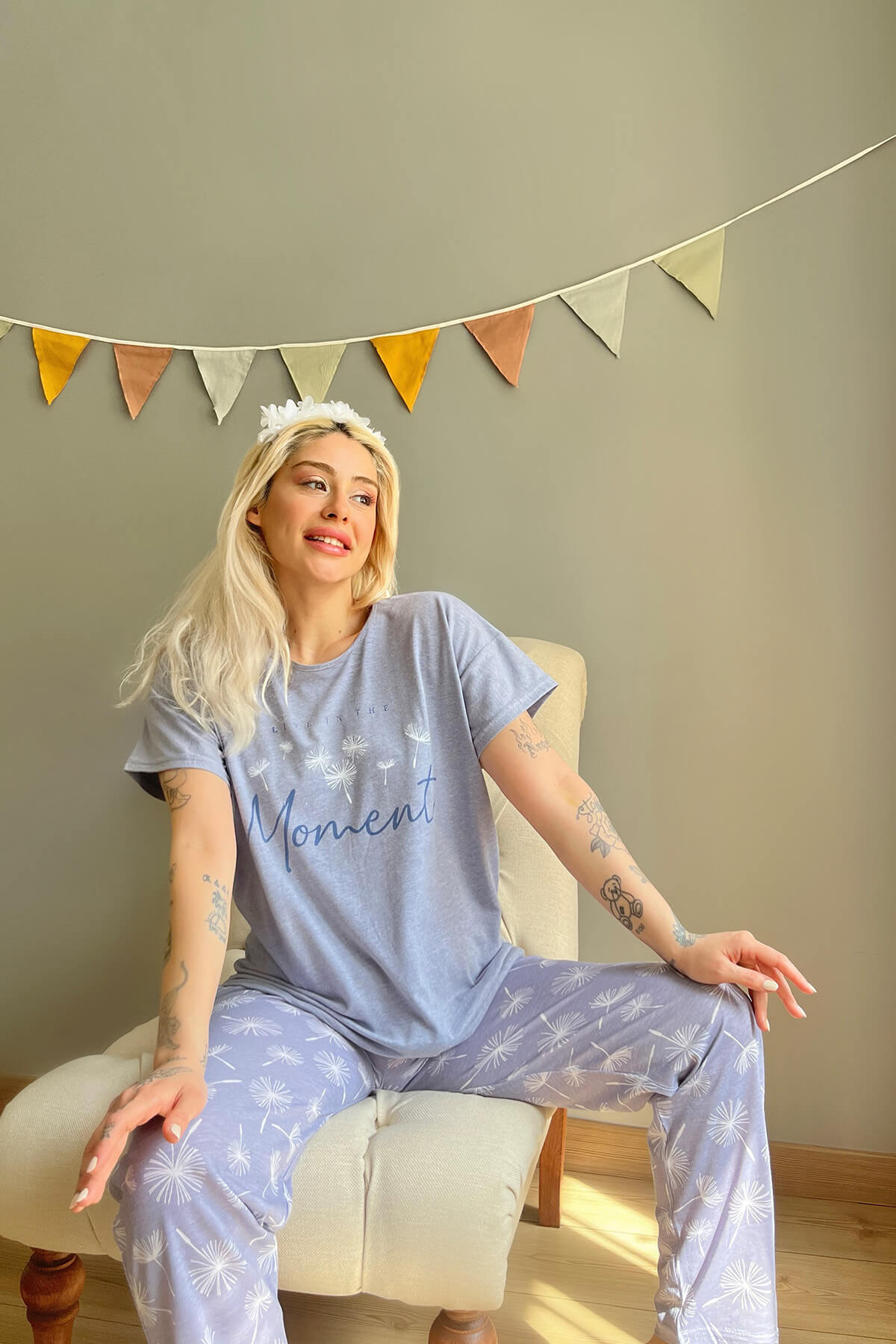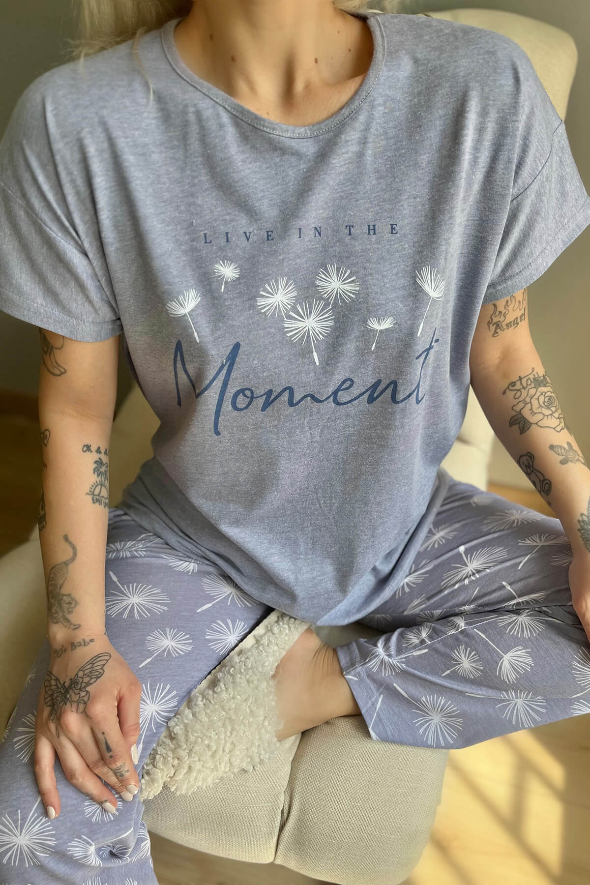 Mavi Moment Baskılı Kısa Kollu Kadın Pijama Takımı - 4