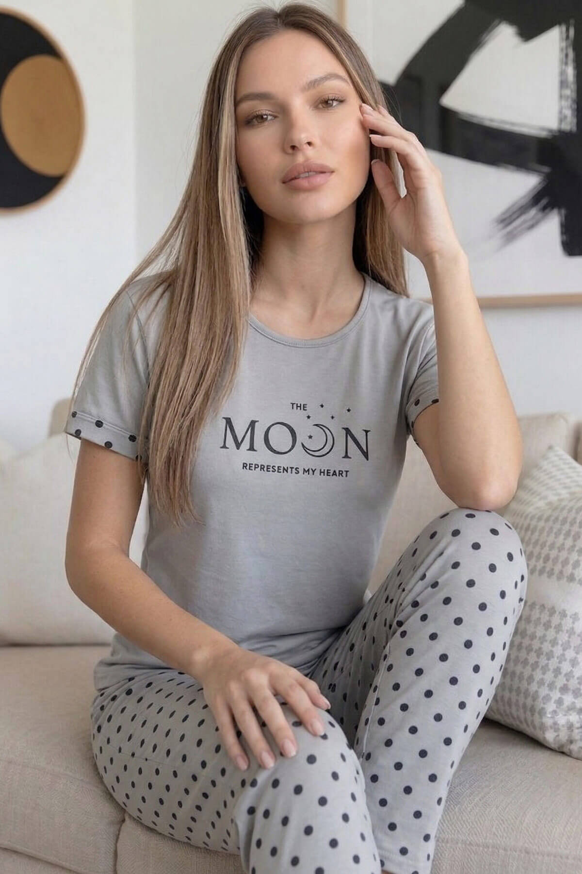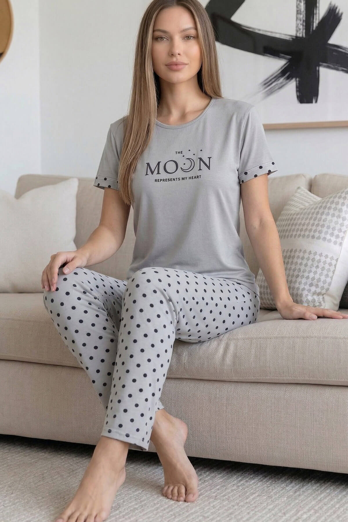 Kısa kollu bisiklet yaka üst tasarımı modern ve sade bir görünüm sunarken; uzun alt pijama rahat kalıbı ile hareket özgürlüğü sağlar. Ev giyimi, uyku ve günlük kullanım için ideal olan bu takım, yumuşak tuşesi sayesinde cilde nazik temas eder.