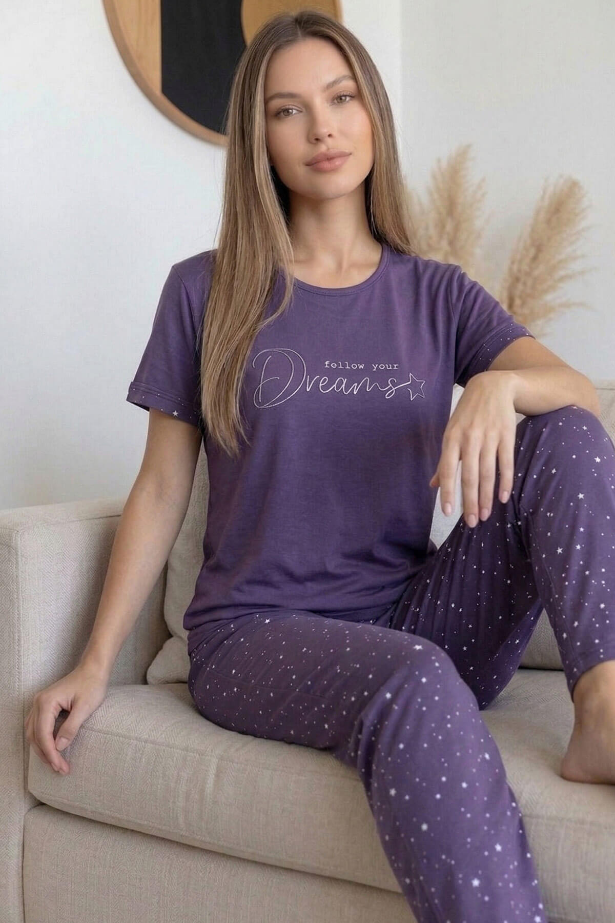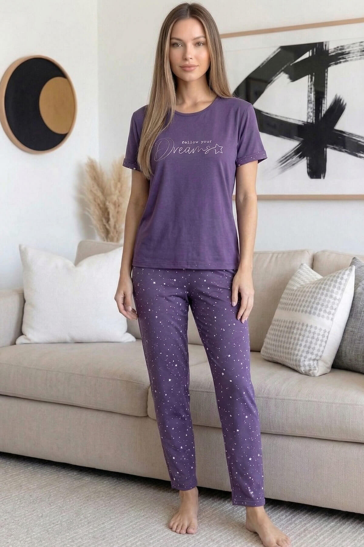 Mor Dreams Desenli Bambu Kısa Kol Kadın Pijama Takımı