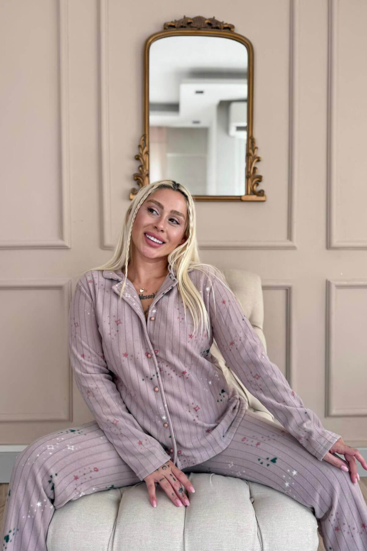 Mor Gri Yıldızlı Kalp Desenli Önden Düğmeli Peluş Polar Pijama Takımı
