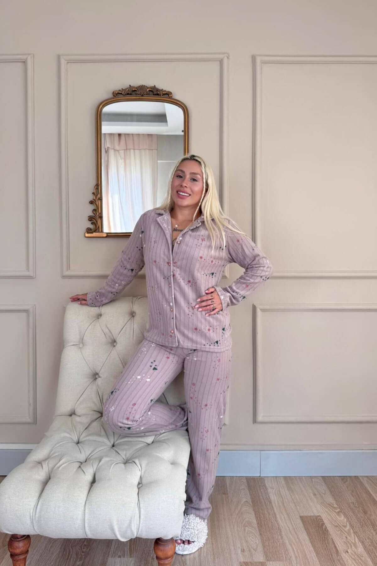 Çizgi Baskılı Önden Düğmeli Uzun Kollu Kadife Pijama Takımı - Pijamaevi Çizgi Baskılı Önden Düğmeli Uzun Kollu Kadife Pijama Takımı - Pijamaevi (1)