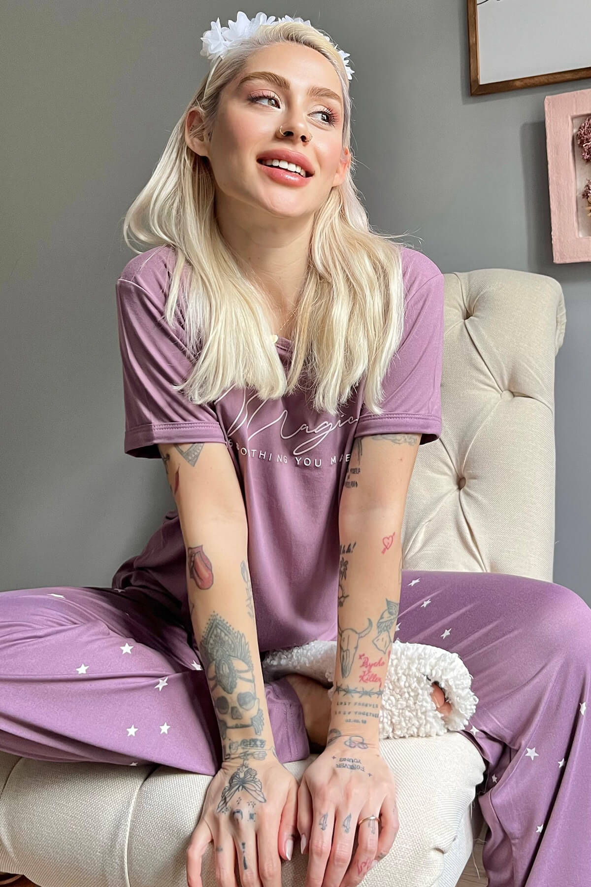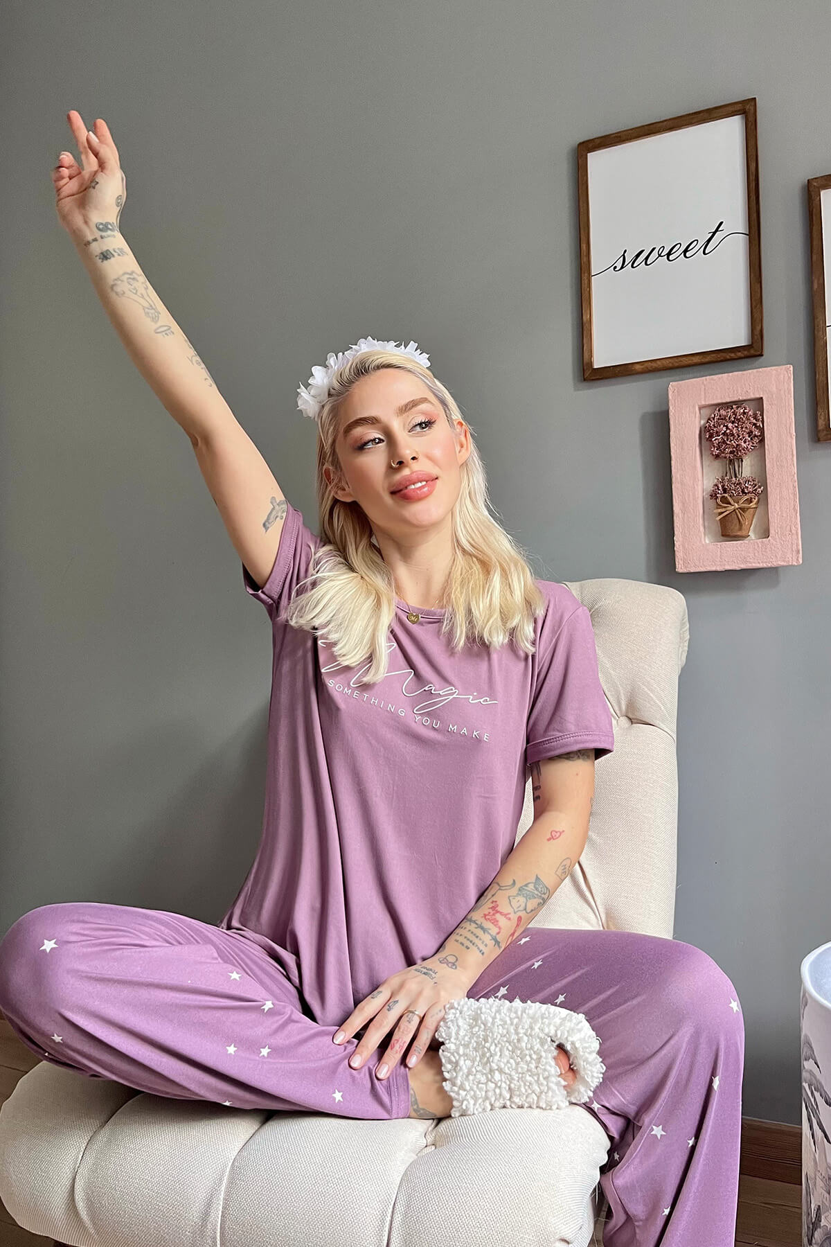 Mor Magic Desenli Bambu Kısa Kol Kadın Pijama Takımı - 1