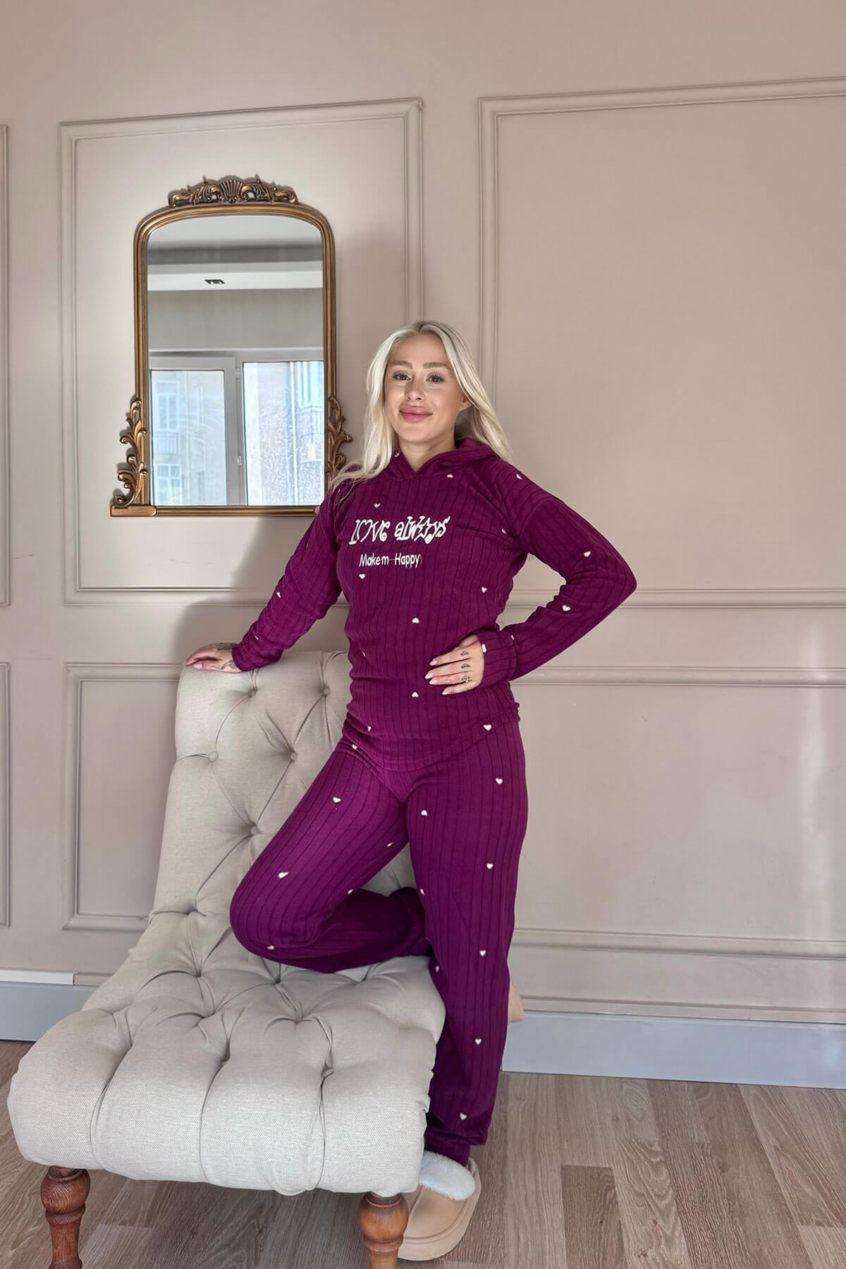 Modern desenleri ve yazı detaylı kapüşonlu üstüyle farklı bir tarz kazandıran pijama takımı, soğuk günlerde hem sizi sıcak tutar hem de enerjik bir görünüm sağlar. Rahat kesimi sayesinde uyurken veya evde vakit geçirirken konforlu hareket etmenizi destekler. Evde sıcak bir konfor arayan kadınlar için hem kullanışlı hem de göz alıcı bir tercih olacak.