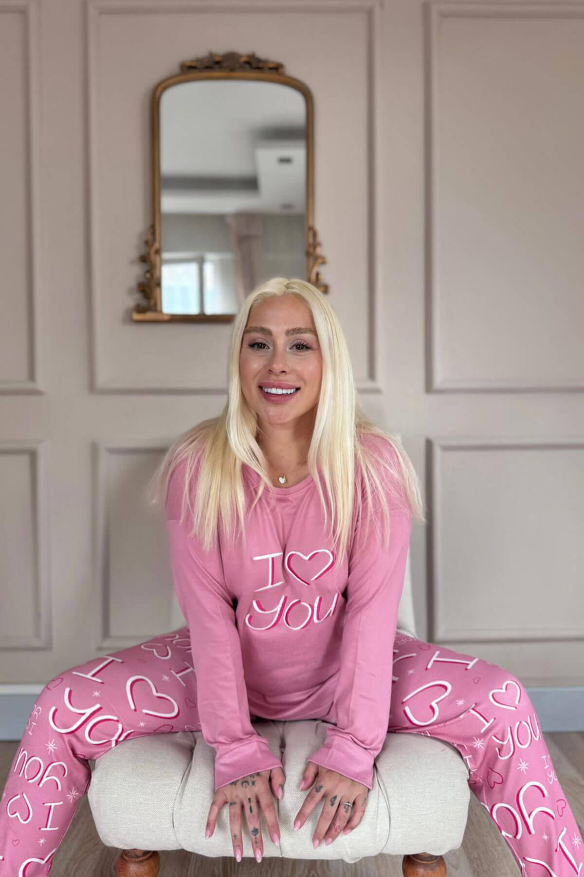 Pembe Love You Desenli Termal Kadın Pijama Takımı